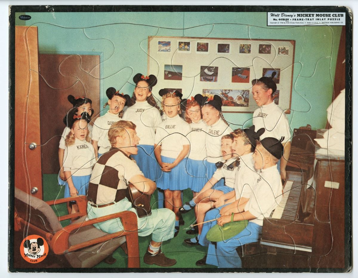 (Whitman, 1956) Mickey Mouse Club tray puzzle featuring a photo of the Mouseketeers (minus Annette) at the Disney Studios. Note what looks to be "Alice In Wonderland" concepts on the wall, and the Kem Weber designed airline chair Jimmy Dodd is sitting in. Puzzle measures 14"x11". In very good condition.