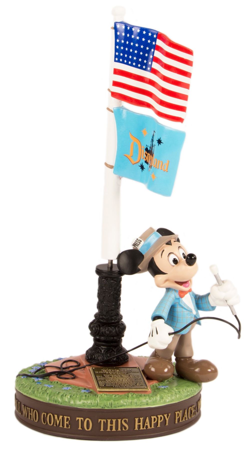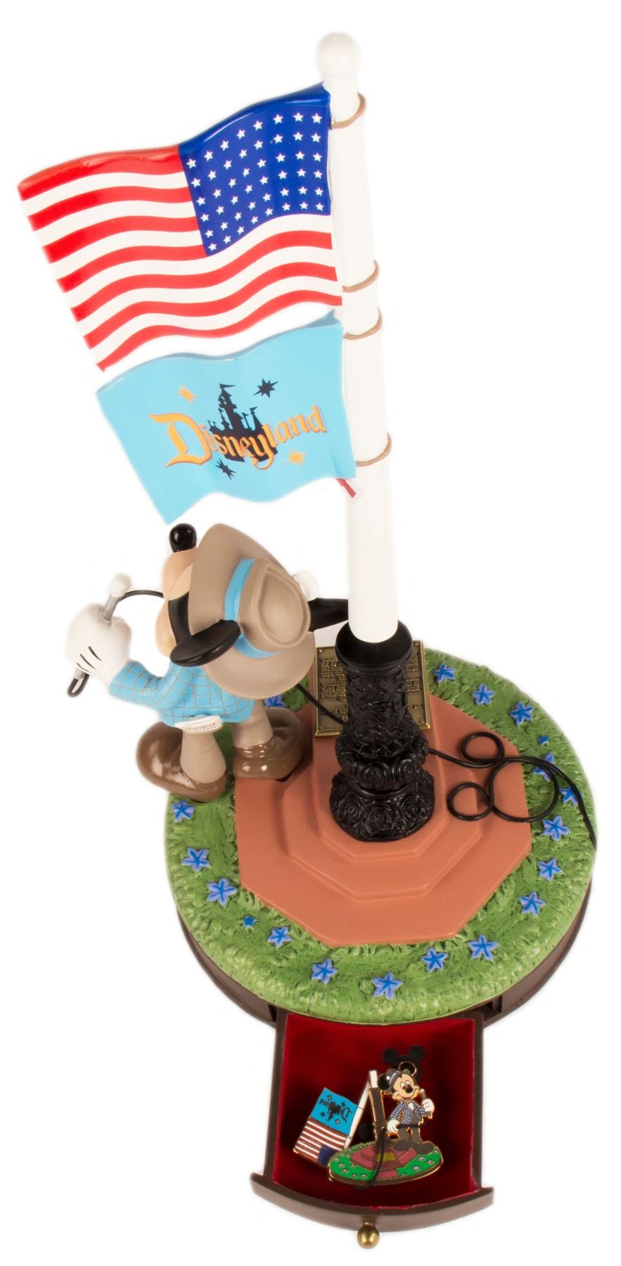 (Disneyland, 2010) A limited edition statue depicting Mickey Mouse as a member of the press reporting from Disneyland's opening day events on July 17, 1955. The statue comes with a special Disneyland dedication plaque pin which rests below the flagpole. Created in resin in an edition of only 500 pieces, the statue measures 13.25" tall. The statue is new and comes in its original box. The reverse has a hidden drawer with an additional pin that resembles the statue.