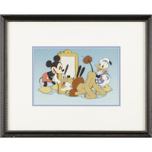 <B>Mickey Mouse, Donald Duck, and Pluto Hand Painted Publicity Cel Original Art (Disney, undated).</B></I> Mickey Mouse and Donald Duck give Pluto a makeover, much to his dismay, in this delightful hand painted cel. Records indicate that this exquisite little gem was a publicity cel, and the craftsmanship is superb. Matted and framed, the image area measures 9" x 6" and the condition is Excellent. <BR><BR><B>Important notice:</B> Heritage usually auctions material at the rate of 200-250 lots per hour. On some occasions eBay Live bid software or the Internet may not be able to keep up with the pace of the auction. We recommend placing a realistic absentee bid now as insurance to avoid disappointment. Occasionally the auctioneer may eliminate or reject an eBay Live bid, and the auctioneer may also reopen a lot after the close of the eBay live bidding (usually because we missed an audience bid), and may reject your bid even if it shows you as the winning bidder. By bidding via eBay Live, you agree that Heritage may award the lot to another bidder at its sole discretion under the circumstances described above or any other reasonable circumstances. Since eBay bids are not shown to us until we open the lot on the floor, we treat those bids just like floor bids. In most cases the floor responds before the eBay bid is presented to us, due to Internet lag time, so for consistency we have made it a policy that floor bids are always considered first over tie eBay live bids. Also please note that all Heritage lots purchased through eBay Live carry a 22.5% Buyer's Premium. Please make sure you read the Terms and Conditions before you bid. This lot is being auctioned in conjunction with a live floor auction by Heritage Auction Galleries. All final auction and invoice information will be supplied by Heritage Auction Galleries, and all other information should be considered preliminary. Lot:41001 <BR><BR><B>Winning Notification and Billing:</B> After the FINAL session in this auction is complete, Heritage will send e-mail and snail mail invoices. This process normally takes several days. All final auction and invoice information will be supplied by Heritage Auction Galleries, and all other information should be considered preliminary. <BR><BR>This auction will be conducted on a live auction floor and over the Internet through eBay Live. If you choose to place an absentee bid, please take a moment to <font color='#0000ff'><u><a href='http://pages.ebay.com/liveauctions/help/before/laabsentee.html'>learn how eBay Live absentee bidding works</a></u></font><font color='#000000'>