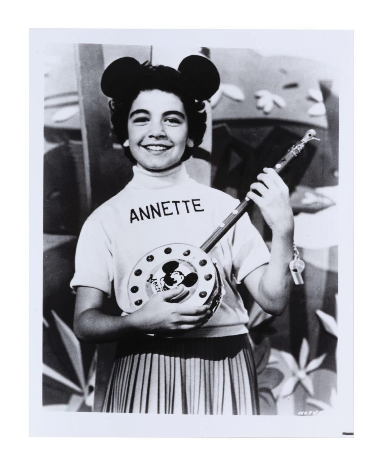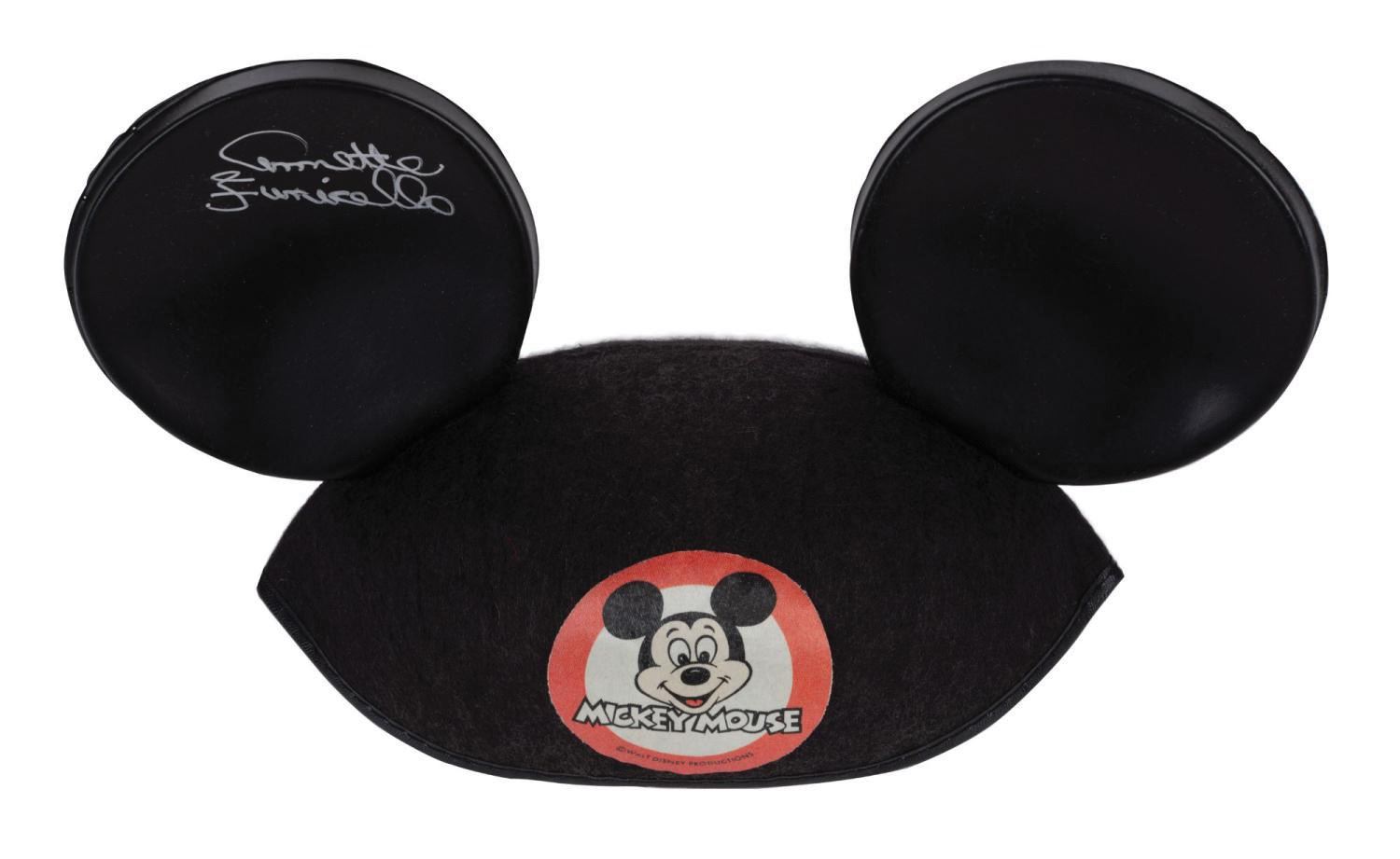 (Disney, c.1990s) A Mickey Mouse ear hat signed by Mouseketeer Annette Funicello. It was originally offered through the Disney-MGM Studio Merchandise Division. Measuring 10" across and 6" tall, the vintage-style hat is in very good condition, exhibiting the slightest wear and two pinholes from previous display. Included is a fine condition Mickey Mouse Club press release photograph featuring Annette playing a banjo, which exhibits little wear.