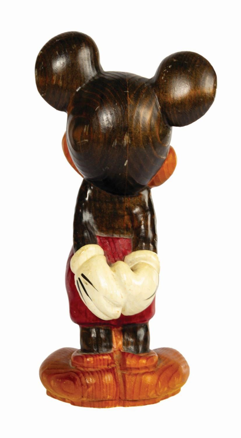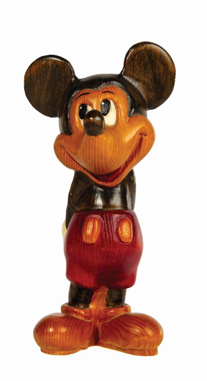 (Disneyland, c.1980s) A wooden Mickey Mouse figure given as an award for a Disney employee training course. The wooden figure depicts Mickey with his hands clasped behind his back and is painted in the classic red, white, and black. A Disney copyright mark is etched into the sole of Mickey's left foot. Measuring 9.75"x4.25" and 3" deep, the figurine is in very good condition with some nicks, chips, scuffs, and paint loss.