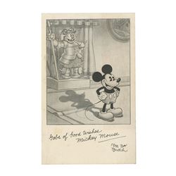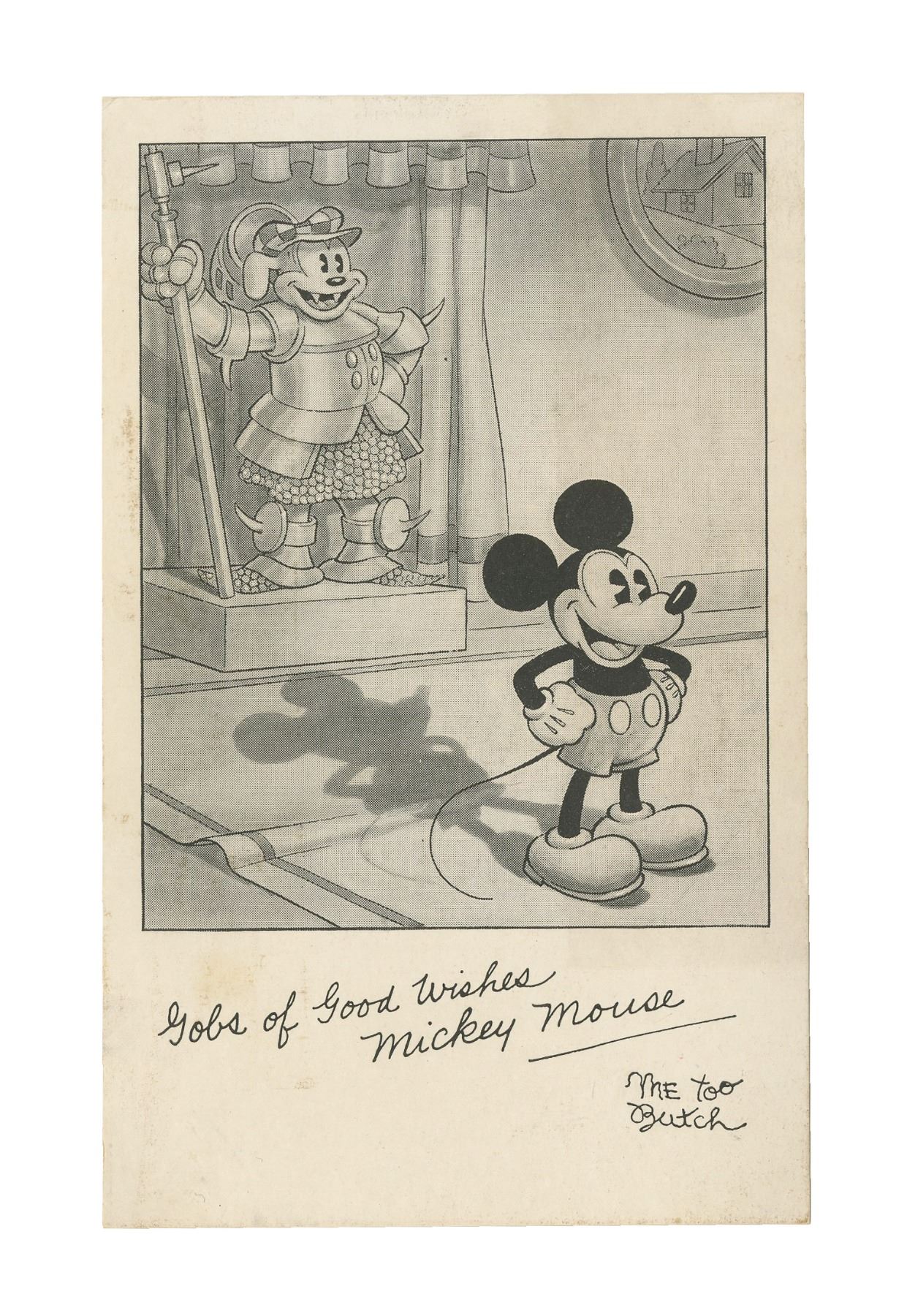 (Walt Disney Studios, 1931) An extremely rare fan card that was offered by newspapers as a premium to their readers and also given to select guests of The Walt Disney Studios around 1931. This card features Mickey Mouse with Butch disguised in armor behind him. Butch was a friend of Mickey's who was introduced in the "Mr. Slicker and the Egg Robbers" storyline of the Mickey Mouse comic strip towards the end of 1930. There are facsimile signatures from both characters at the bottom of the card. Measuring approximately 5.5"x3.5", the card is in very good condition with some small areas of discoloration to the front of the card. The back of the card has a note in ink from the original recipient who visited The Walt Disney Studios in August of 1931.