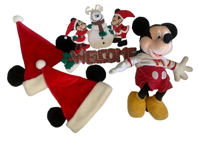 A Mickey Mouse holiday collection of a welcome sign with Mickey and Minnie, 2 Mickey Santa hats and a stuffed Milestone Mickey Mouse plush from 1995 in brand new condition.