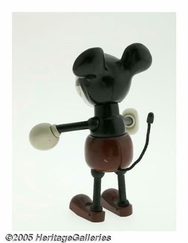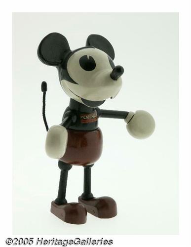 <B>Mickey Mouse Large Fun-e-Flex (George Borgfeldt & Company, 1930s).</B></I> Walt Disney's first licensee was George Borgfeldt & Company. They distributed a variety of wooden Disney characters under the "Fun-e-Flex" name. All the parts of this wonderful doll are made of solid wood and are entirely jointed. The condition of this piece will astound you. The body is complete, with no dents or scratches, the jointed limbs are all in working order, and the colors sparkle. The Mickey Mouse label is intact, and fully legible. Includes the tail, which is also in great condition. It looks brand new! This sweet wooden toy would put a smile on anyone's face. Measures 9" tall with movable arms and legs. <I>From the Larry Jacobs Collection.</B></I>