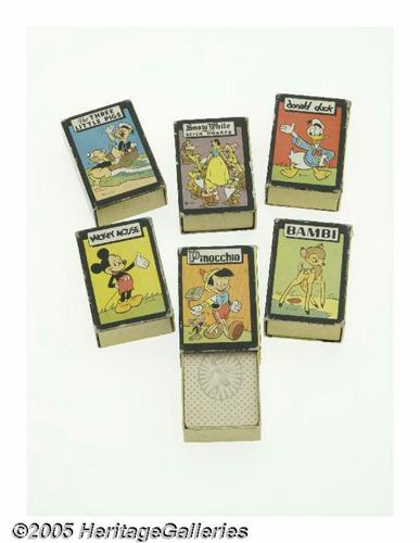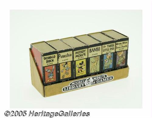 <B>Mickey Mouse Library of Card Games with Box (Russell Manufacturing Company, 1946).</B></I> Six volume <B>Mickey Mouse Library of Games</B></I> in holder, featuring Donald Duck, Pinocchio, Mickey Mouse, Bambi, The Three Little Pigs, and Snow White character games. Game volumes are in Good condition with some edge wear and rubbing. Holder has edge wear and the front flap is loose. <I>From the Larry Jacobs Collection.</B></I>