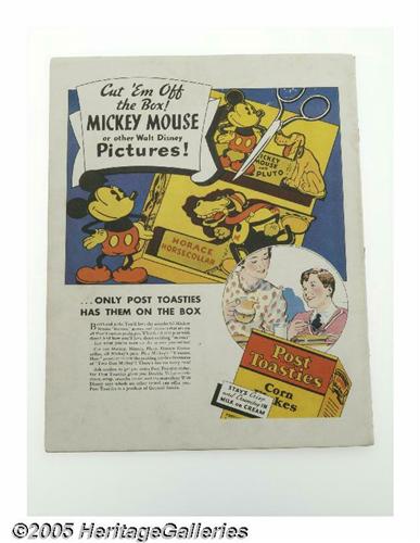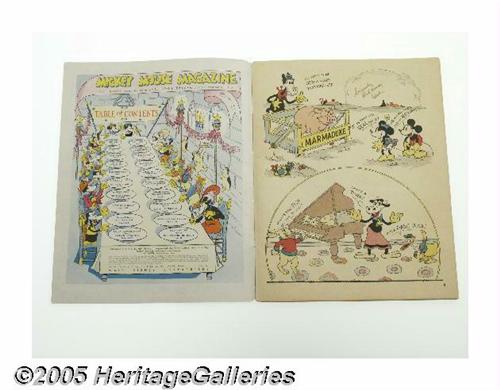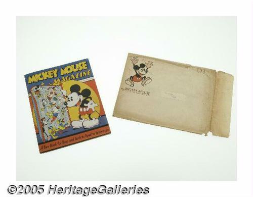 <B>Mickey Mouse Magazine #1 with Mailing Envelope (Hal Horne Incorporated, 1935) Condition: FN-.</B></I> The first issue of Mickey Mouse Magazine, produced in the summer of 1935, was a special project of Kay Kamen's that he felt would promote all things Mickey -- especially Mickey Mouse movies and Mickey-themed merchandise. Containing puzzles, games, stories, and comics of Disney characters, this was in reality a promotional magazine for Disney cartoon movies and paraphernalia. This book was sent by mail to P.T. Buckley in Jackson, Mississippi back in 1935, and we've got the only known example of the original mailer to prove it! The mailer is complete, but brittle with many creases. The magazine's cover is in Excellent condition, with only a modest amount of wear along the spine. With its gorgeous glowing color, and only minimal aging apparent on the interior, we defy you to try to find a more beautiful copy of this book! Issues of this magazine are extremely rare collectibles, and this first issue in particular is highly prized. Also, this book is signed by editor Hal Horne on the first page. Truly, a bit of Disney history -- own it today! Overstreet 2005 FN 6.0 value = $3,750 (and that's without the mailer!). <I>From the Larry Jacobs Collection.</B></I>