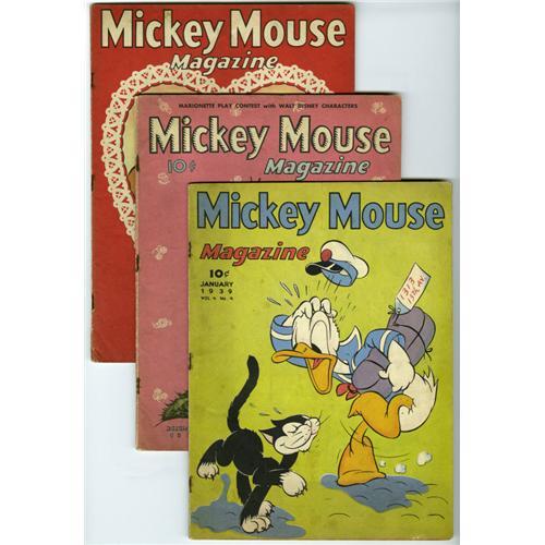 <B>Mickey Mouse Magazine Group (K. K. Publications, Inc., 1939) Condition: Average VG.</B></I> These large-format magazines which mixed comics with games, puzzles, and stories are quite collectible today, not least because this title is the forerunner of <B>Walt Disney's Comics and Stories</B></I>. Included here are V4#3, V4#4, V4#5, V4#7 (March 1939 issue), the second V4#7 (two issues received the same number, this is the April 1939 issue), V4#8, V4#9, V4#10 (classic drum-and-fife cover), V4#11, V5#1, and finally V5#3, which is the first comic book appearance of Jiminy Cricket. Almost all have some rust migration at the staples. The crossword puzzle in each issue has been completed in pencil. Approximate Overstreet value for group = $1,250.