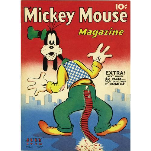<B>Mickey Mouse Magazine V3#10 (K. K. Publications, Inc., 1938) Condition: NM-.</B></I> Goofy spots trouble from behind on this colorful cover. It's the Goof's first solo cover appearance! This copy looks very fresh and clean; however, all three staples have lightly rusted (with a very minor amount of rust migration), and a crossword puzzle inside has a few entries in light blue pencil. Overstreet 2006 NM- 9.2 value = $600.