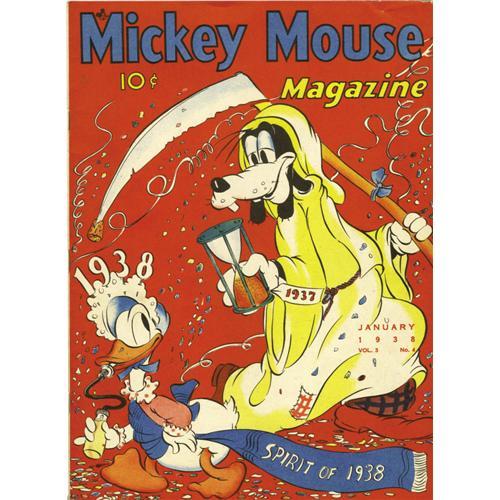 Donald and Goofy ring in the new year of 1938 with this delightful cover -- doesn't Donald make a cute baby? Inside, the Snow White and the Seven Dwarfs serial begins. Overstreet 2006 VF 8.0 value = $544.<BR><BR><b>Shipping:</b> Un-Slabbed Comic (<a target="_blank" href="http://www.heritageauctions.com/common/shipping.php">view shipping information</a>)