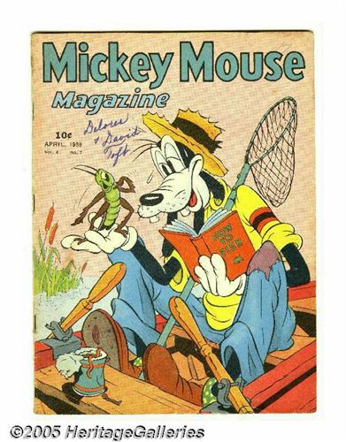 <B>Mickey Mouse Magazine V4#7 - April (K. K. Publications, Inc., 1939) Condition: VG.</B></I> Classic cover and story featuring Goofy and Wilbur the Grasshopper adapted from the first full-length Goofy movie. Timid Elmer begins in this issue. The owner's name is written on the cover, not affecting Disney graphics. One interior crossword puzzle was filled in with pencil. Pages four and five were not separated during the trimming process (siamese pages) so tears exist along the edges. Overall minor general wear and soiling. Nice deep colors. Overstreet 2005 VG 4.0 value = $96. <I>From the Larry Jacobs Collection.</B></I>