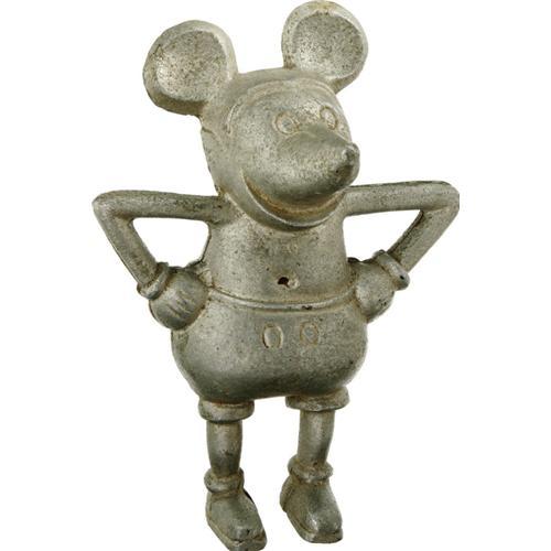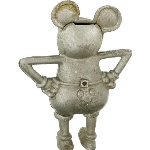 <B>Mickey Mouse Metal Coin Bank.</B></I> Vintage aluminum coin bank in the likeness of Mickey Mouse, circa 1930s, 9" tall and made of aluminum and unpainted. A nut on the back unscrews to allow the body to separate in halves and the money to be retrieved. In Excellent condition with light surface wear and some rust to the bolt on back. <BR><BR><B>Important notice:</B> Heritage usually auctions material at the rate of 200-250 lots per hour. On some occasions eBay Live bid software or the Internet may not be able to keep up with the pace of the auction. We recommend placing a realistic absentee bid now as insurance to avoid disappointment. Occasionally the auctioneer may eliminate or reject an eBay Live bid, and the auctioneer may also reopen a lot after the close of the eBay live bidding (usually because we missed an audience bid), and may reject your bid even if it shows you as the winning bidder. By bidding via eBay Live, you agree that Heritage may award the lot to another bidder at its sole discretion under the circumstances described above or any other reasonable circumstances. Since eBay bids are not shown to us until we open the lot on the floor, we treat those bids just like floor bids. In most cases the floor responds before the eBay bid is presented to us, due to Internet lag time, so for consistency we have made it a policy that floor bids are always considered first over tie eBay live bids. Also please note that all Heritage lots purchased through eBay Live carry a 22.5% Buyer's Premium. Please make sure you read the Terms and Conditions before you bid. This lot is being auctioned in conjunction with a live floor auction by Heritage Auction Galleries. All final auction and invoice information will be supplied by Heritage Auction Galleries, and all other information should be considered preliminary. Lot:41001 <BR><BR><B>Winning Notification and Billing:</B> After the FINAL session in this auction is complete, Heritage will send e-mail and snail mail invoices. This process normally takes several days. All final auction and invoice information will be supplied by Heritage Auction Galleries, and all other information should be considered preliminary. <BR><BR>This auction will be conducted on a live auction floor and over the Internet through eBay Live. If you choose to place an absentee bid, please take a moment to <font color='#0000ff'><u><a href='http://pages.ebay.com/liveauctions/help/before/laabsentee.html'>learn how eBay Live absentee bidding works</a></u></font><font color='#000000'>