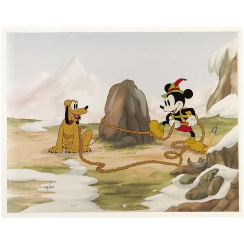 <B>Mickey Mouse "Mickey's 60th Birthday" Limited Edition Animation Cel and Matching Background Group, 448/950 (Walt Disney, 1988).</B></I> A matching pair of Limited Edition cels. In the first; a pie-eyed Mickey and Pluto ready themselves for mountain climbing; in the second, Mickey greets Minnie by tipping his straw hat. Attractive Limited Edition set of three-hole cel and matching background print set-ups, with the original envelopes and certificates. Excellent condition.<BR><BR><b>Shipping:</b> Flat Material, Small (<a target="_blank" href="http://www.heritageauctions.com/common/shipping.php">view shipping information</a>)