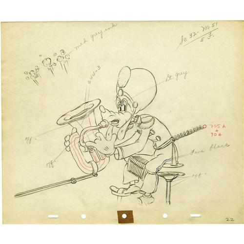 <B>Mickey Mouse "Mickey's Amateurs" Animation Production Drawing Original Art (Disney, 1936).</B></I> Goofy is a one-man band, in this fanciful drawing from his short film, "Mickey's Amateurs." Rendered in graphite and red pencil on a 12 field sheet of animation paper, this is OPD #22. There is some paper tanning; otherwise the condition is Excellent.<BR><BR><b>Shipping:</b> Flat Material, Small (<a target="_blank" href="http://www.heritageauctions.com/common/shipping.php">view shipping information</a>)