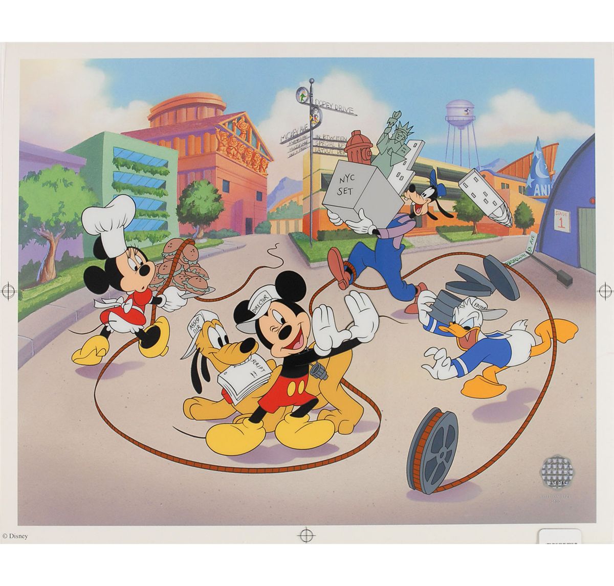 (Walt Disney Studios, 2000) Limited edition sericel featuring Mickey Mouse, Minnie Mouse, Donald Duck, Pluto, and Goofy, entitled ‘Movie Magic with the Fab Five,’ released in an edition of 2500. The cel is placed on a matching studio copy background. Image measures 13.5 x 9.5, with overall dimensions of 16.5 x 13.5. The piece has the Disney hologram to lower right and includes the certificate of authenticity. In fine condition.