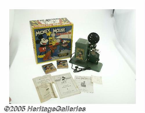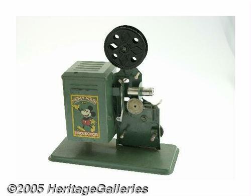 <B>Mickey Mouse Movie Projector with Box (Keystone Manufacturing Company, 1934).</B></I> Even in a collection of the quality of the Larry Jacobs Collection, certain items are so visually attractive that they stand out from the rest... and this is the case with the Keystone Mickey Mouse Movie Projector. Produced in 1934 by the Keystone Manufacturing Company in Boston, the large illustrated box features among the most attractive early Disney images we've seen. The projector itself is complete and features two boxed Disney films. Nearly as eyecatching as the box, the dark lime green metal projector features a nifty color name/image of The Mouse. With the original instruction book present, the projector shows only minimal wear. A close examination of the box reveals some chipping along edges/corners, corner separations, light scratching/scuffing; overall in excellent condition. If you want to impress the members of your local collectors club at their next meeting, this is the one! Absolutely choice vintage Disneyana. <I>From the Larry Jacobs Collection.</B></I>