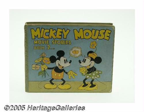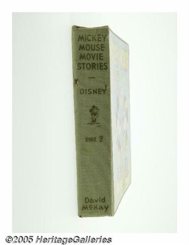 <B>Mickey Mouse Movie Stories Book 2 (David McKay Company, 1934).</B></I> Generally considered to be more difficult to obtain than the first volume, this oblong David McKay volume from 1934 is complete; interior paper quality is good, binding is okay -- heavy stock paper used generally results in some looseness to binding. Child's markings on back of title page, inside front cover and first interior page. Binding wear at top/bottom of spine, couple of small holes in spine. Pencil markings on back cover, some faint cover crayon markings, light scuffing, edge/corner wear. A presentable copy of an early and scarce early Mickey Mouse book. <I>From the Larry Jacobs Collection.</B></I>