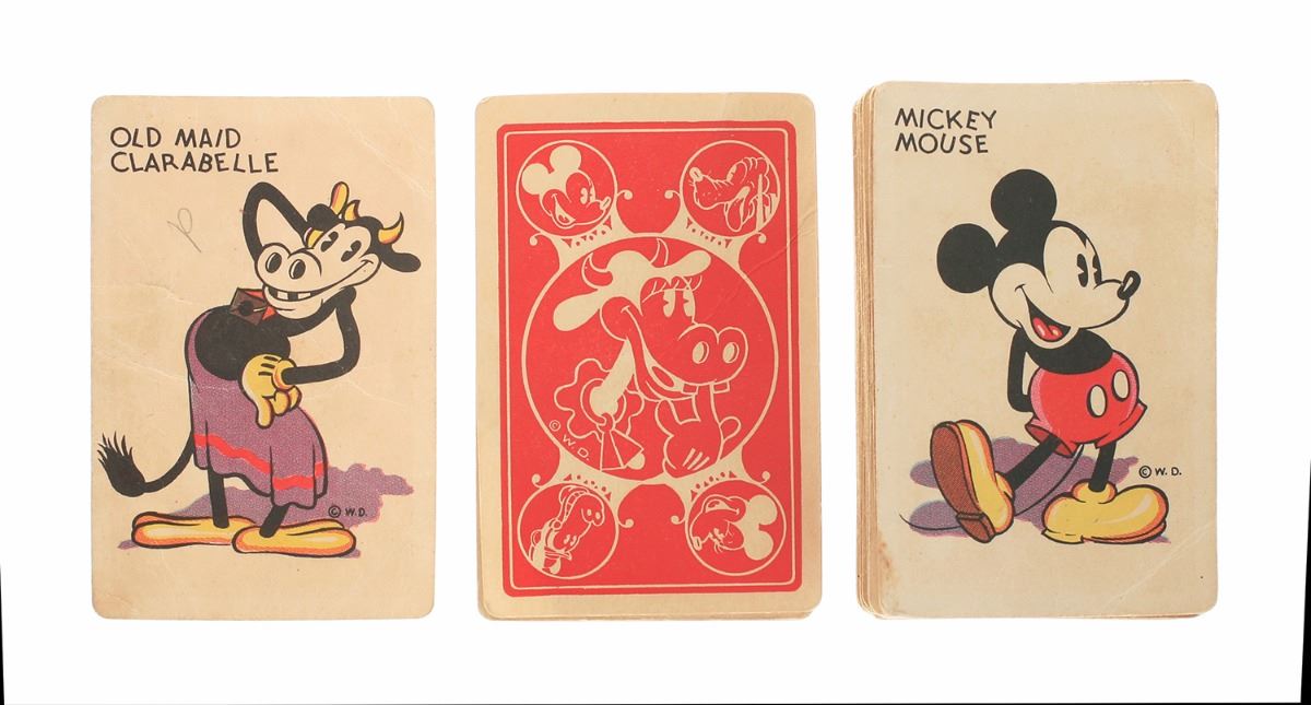 (Whitman Publishing Co., 1935) This illustrated set of Mickey Mouse themed Old Maid cards were created by Whitman Publishing and sold by vendors throughout the United States. This particular set still retains its original sales sticker on the bottom of the box. This is a complete set of (35) cards including the additional instruction card, and comes in its original box. Box measures 6.5"x5"x1". In very good used condition with some wear throughout. Some light pencil marks on the box and on a few of the cards.