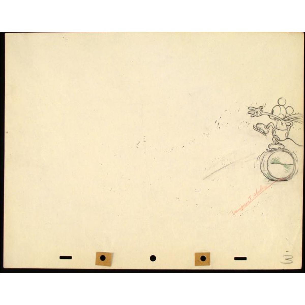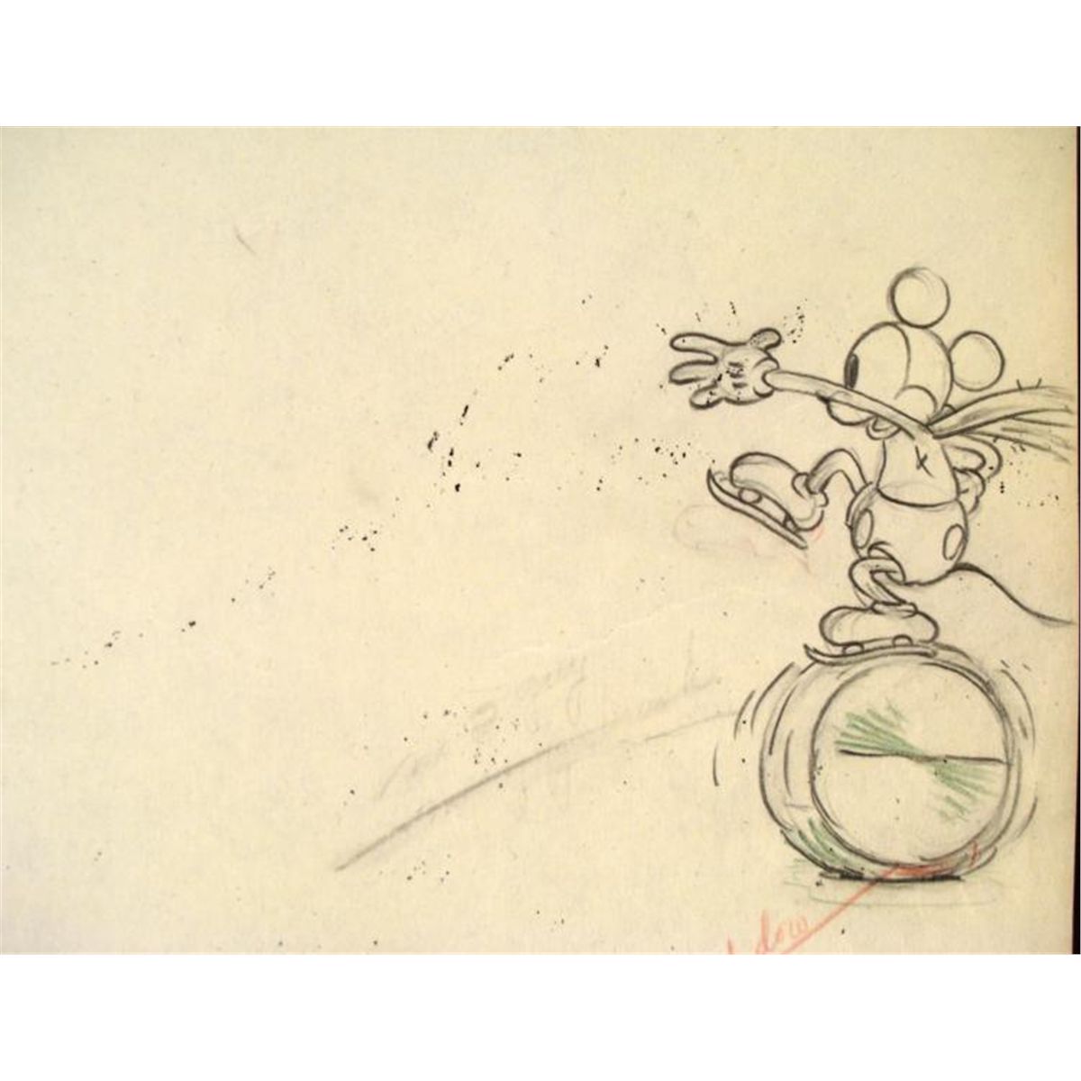 Walt Disney has been making millions upon millions of people smile with his incredible list of Disney characters. The one that everyone has come to love and one of Walt's first was Mickey Mouse. Here, Mickey is trying to balance himself on a rolling log, wearing ice skates! * Original "rough" animation drawing, in black and green (on the log) with the notations in black and red. * Overall size: 9 1/2" x 12" Excellent condition * Traditional animation is a multi-step process which includes various types of art techniques. Drawings are a key part of the process, in which the animator creates the design and movement of the characters. Drawings are then transferred onto acetate cels (by hand-inking and/or photo copying) to create a production cel, which is then hand painted on the back side, using paint colors chosen and approved by the creator of the series. * * The drawing is ready to be matted and framed. The animators notations are located at the top of the drawing. *
