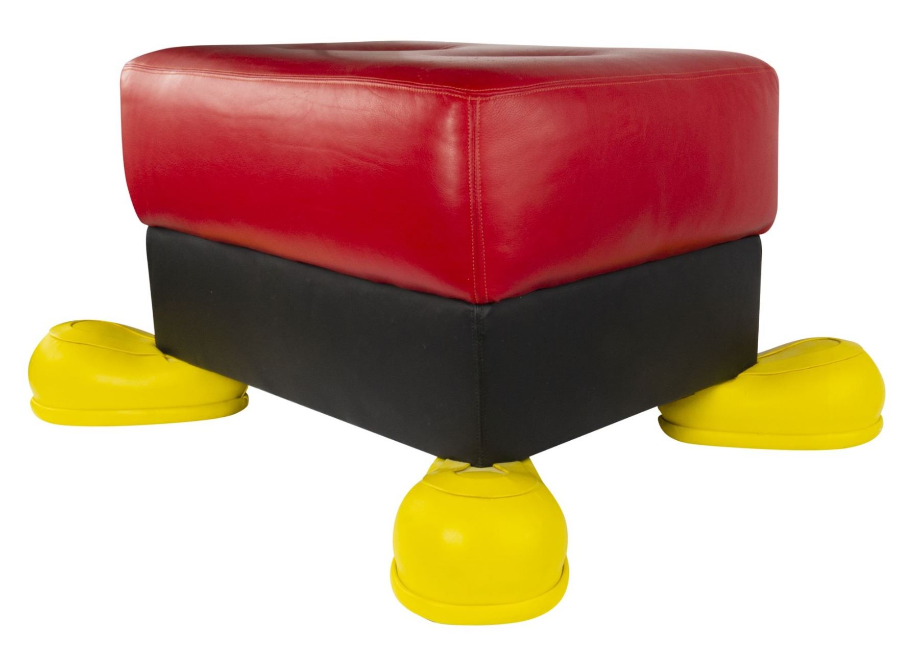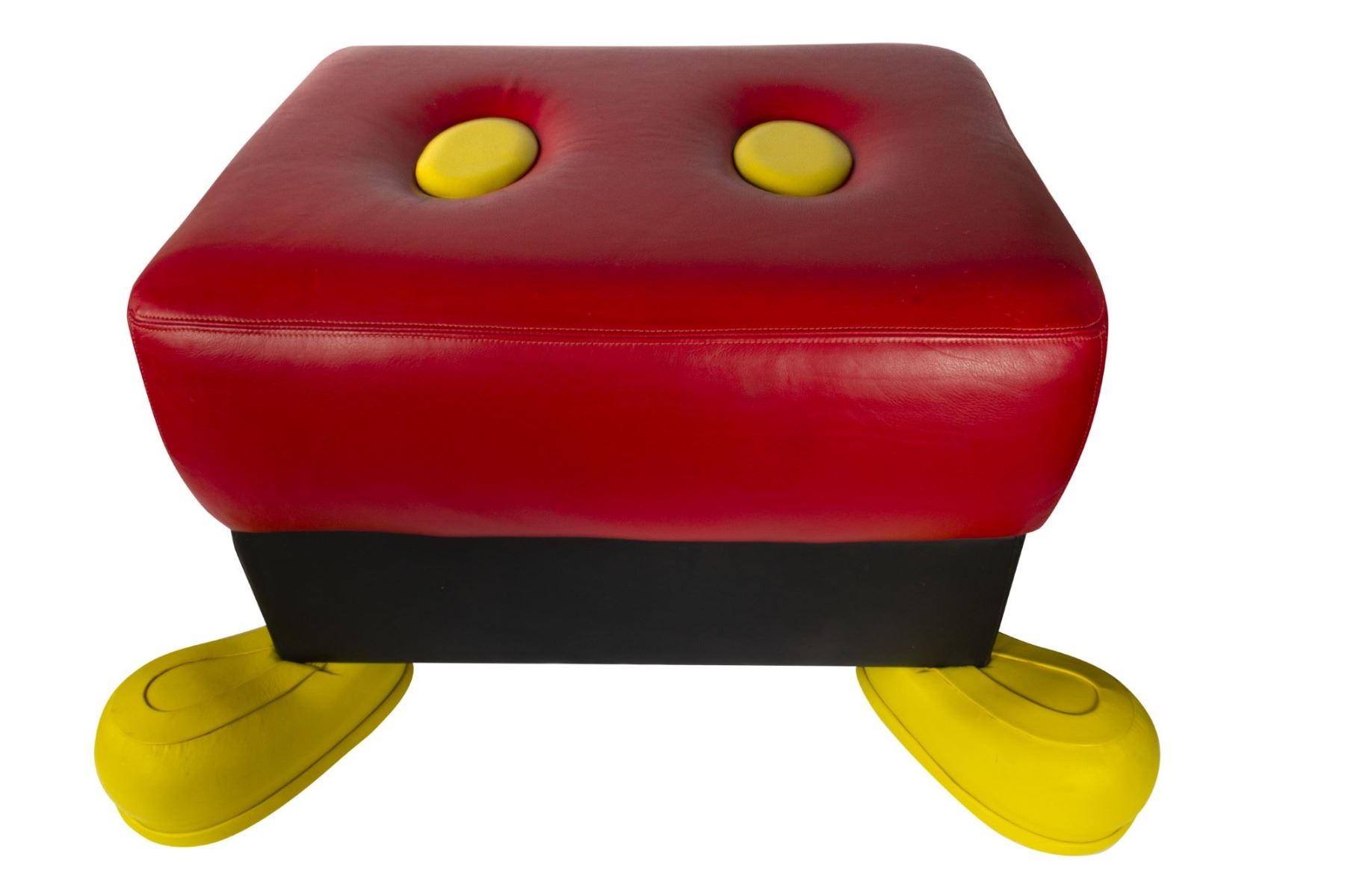 (Walt Disney Studios, c.1990s) A rare Mickey Mouse ottoman created by designer Paddy Gordon. This ottoman features Mickey's trademark buttons on the top, with his large yellow shoes serving as the feet. Both the feet and cushion are upholstered in leather. The cushion measures 20"x26", while the overall ottoman measures 28"x34" and 18.5" tall with the feet included. The condition is good, with some minor scuffing on the feet and several small puncture marks in one corner from use.