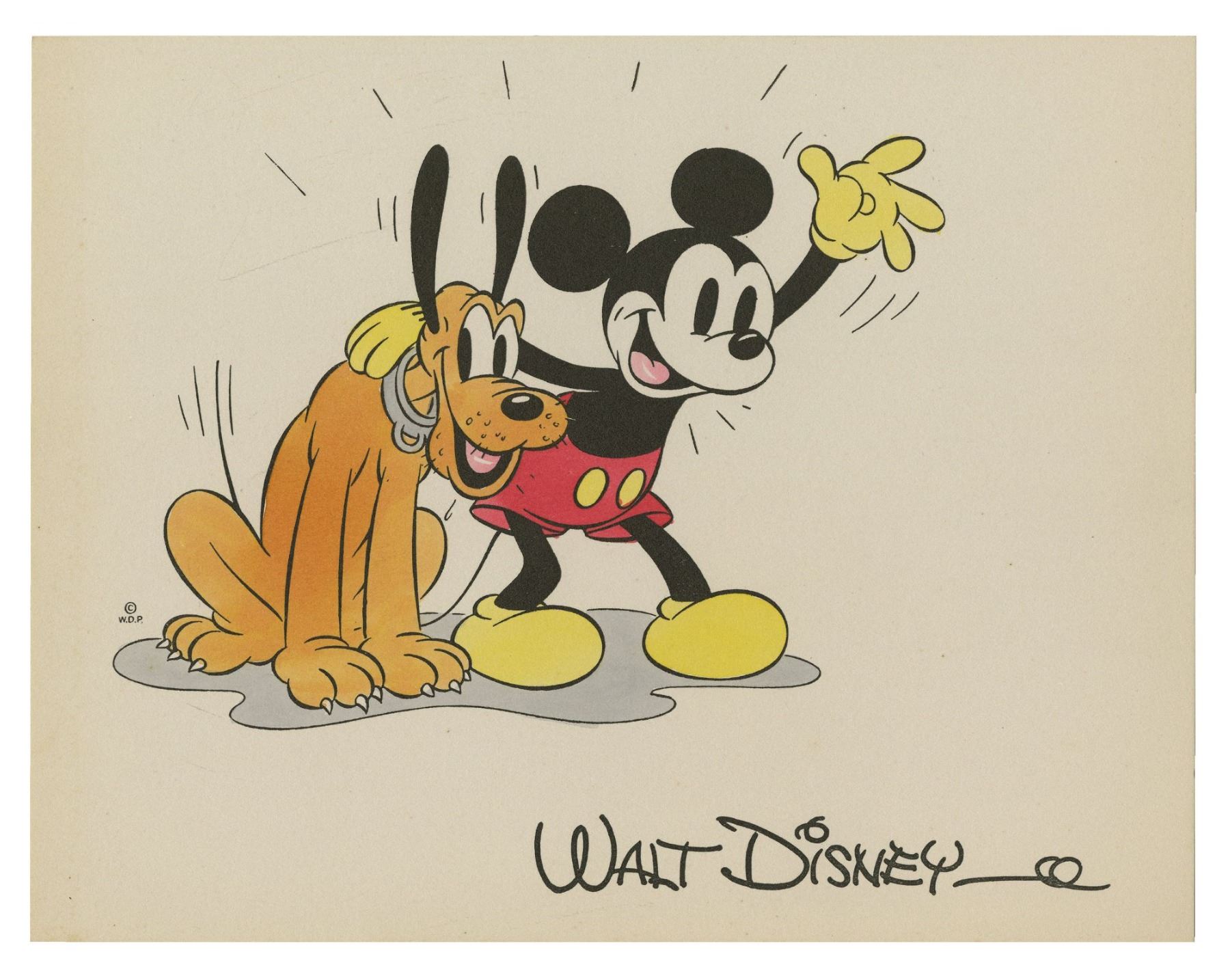 (Walt Disney Studios, c.1930s-40s) A hand-colored fan card from Walt Disney Productions that depicts Mickey Mouse and Pluto above a facsimile Walt Disney signature. The hand-colored studio fan cards are some of the most highly sought-after and unique collectibles from the early days of the Walt Disney Studios. All of the color is hand painted in watercolor, while the dark black is printed. Measuring 7.25"x9.25", the fan card is in very good condition with minor wear.