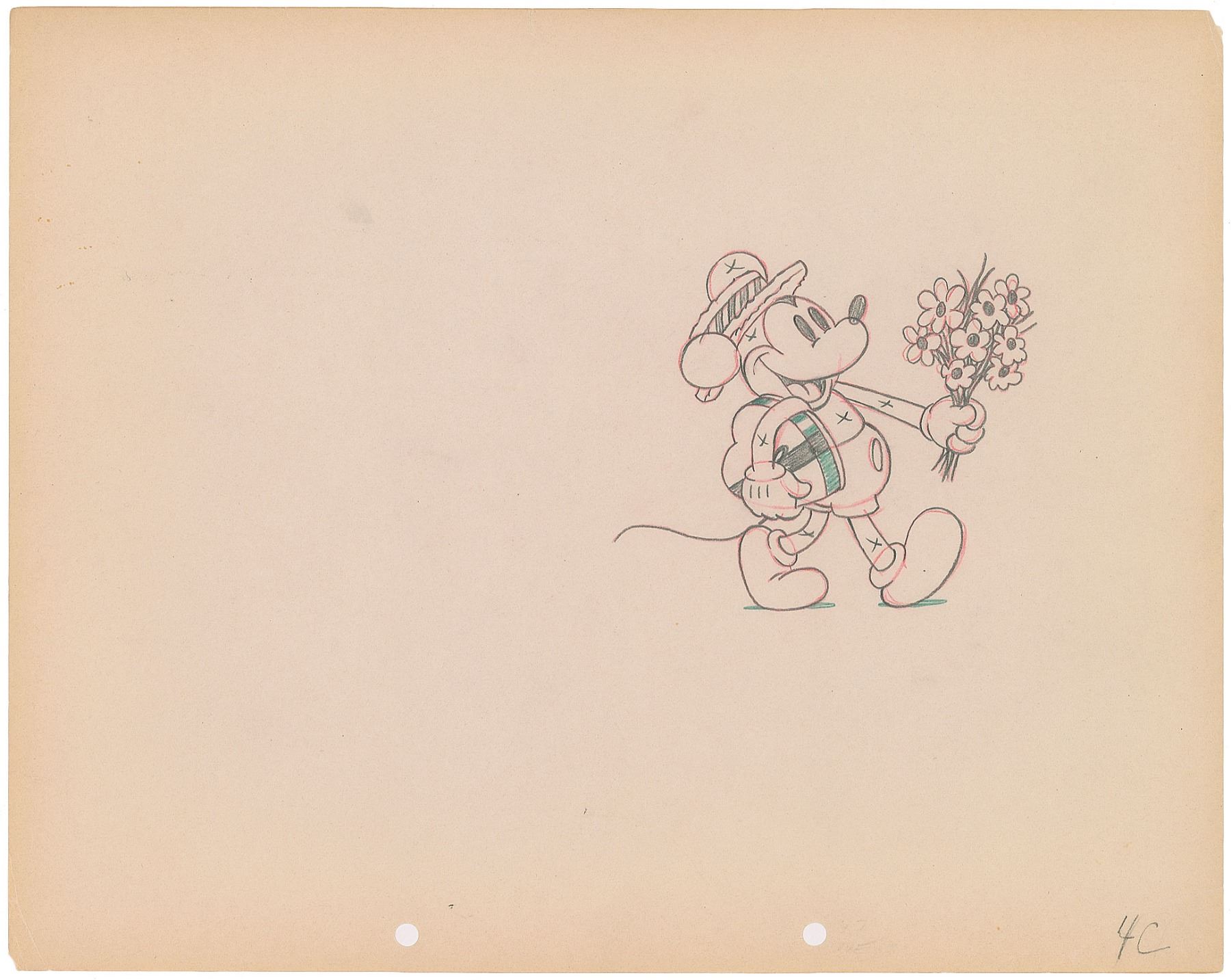 (Walt Disney Studios, 1933) Cute original production drawing featuring Mickey Mouse from Puppy Love, showing the iconic Disney character carrying a box of chocolates and a bouquet. Accomplished in graphite and colored pencil on untrimmed 12 x 9.5 animation paper. Image measures 4.25 x 3.5. In fine condition.