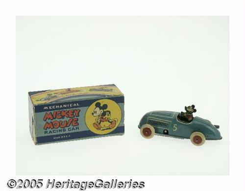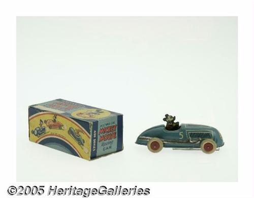 <B>Mickey Mouse Race Car with Box (Lindstrom, 1930s).</B></I> Our favorite mouse is behind the wheel of this mechanical racing car, manufactured by Lindstrom. Mickey puts the pedal to the metal in this light blue lithographed tin wind-up car, complete with its original box. The 4" car is sharp, with vivid color, and still very glossy. The Mickey Mouse figure has a bit of color loss. Otherwise, the tires are in great condition, and the wind up mechanism is clean and intact. Overall, in Excellent condition. The box is also quite nice, with very little wear, and only a small tear and paper loss on one flap. Still in Excellent condition. Burn rubber and win this snappy little sensation! <I>From the Larry Jacobs Collection.</B></I>