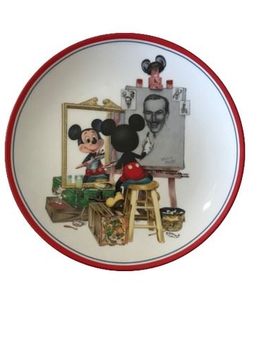 This is a collectible plate from the art of Disney featuring the theme: self-portrait: Mickey Mouse. Original art by Charles Boyer, made exclusively for theme parks and resorts of Walt Disney. In this classic scene the artist Mickey Mouse is shown happily painting his self portrait in the image of his creator, Walt Disney. Made in Japan.
