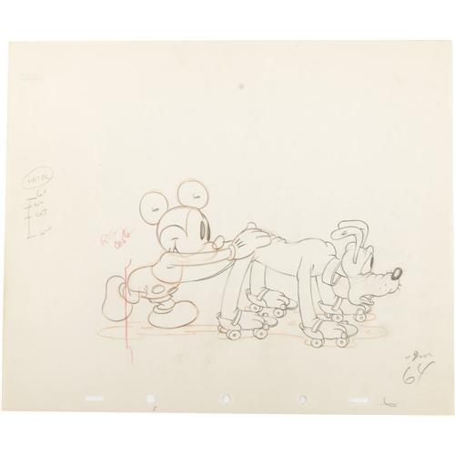 <B>Mickey Mouse "Society Dog Show" Animation Production Drawing Original Art (Disney, 1939).</B></I> Mickey pushes his best pal, Pluto, on a set of roller skates, in the drawing from the delightful 1939 short cartoon, "Society Dog Show." Rendered in graphite and red pencil on a 12 field sheet of animation paper (OPD #64). Some paper tanning; otherwise the condition is Excellent.<BR><BR><b>Shipping:</b> Flat Material, Small (<a target="_blank" href="http://www.heritageauctions.com/common/shipping.php">view shipping information</a>)