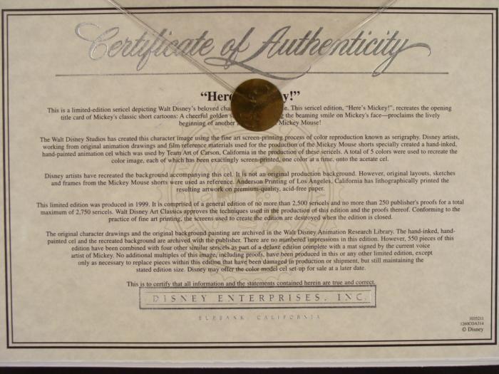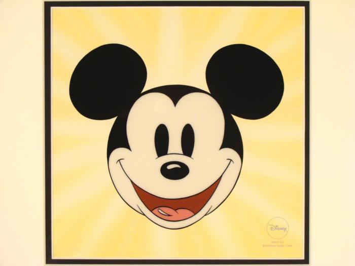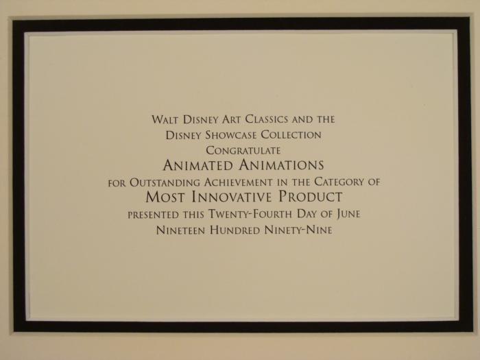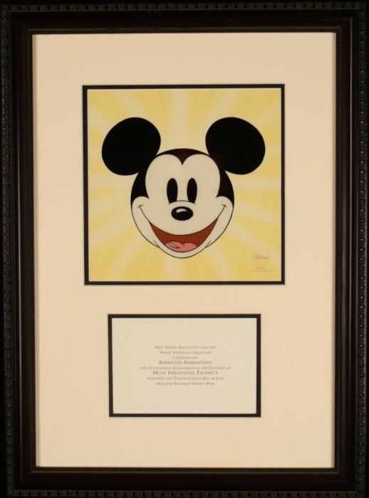 This is a rare award presented to the publisher for outstanding achievement in the "Most Innovative Product" category. It was given in 1999, and only one of these is known to exist. Along with the text, this award consists of a classic Mickey Mouse sericel on yellow background, with Disney stamp. Medium: Sericel with special awardCel size: 8 x 8 inchesFraming: Double matted in black and off-white, with decorative black wood frameFrame size: 15 1/4 x 21 inchesCondition: Excellent, with some scuffs along the top edge of the frameCertificate of Authenticity: From Disney Enterprises, Burbank, affixed to the backThis is a one-of-a-kind piece, and a fine Mickey Mouse cel, for the true Disney collector.