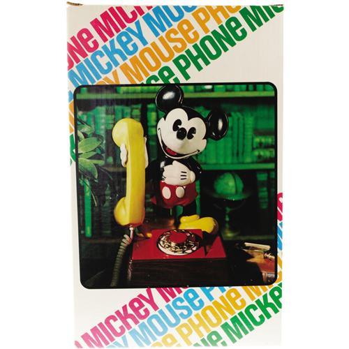 <B>Mickey Mouse Telephone in Original Box (American Telecommunications Corporation, 1976) Condition: NM.</B></I> Classic "pie-eyed" Mickey vintage telephone, with rotary dial, yellow handset, and wooden base, in the original box. This item is believed to be like new, and never used.<BR><BR><b>Shipping:</b> Other (oversized items, group lo (<a target="_blank" href="http://www.heritageauctions.com/common/shipping.php">view shipping information</a>)