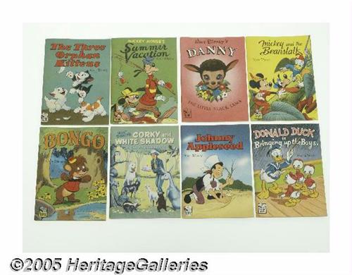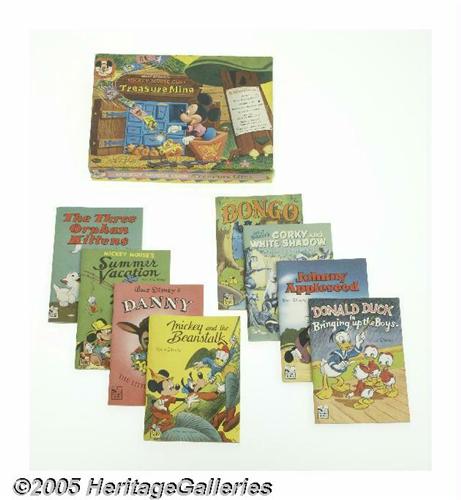 <B>Mickey Mouse Treasure Mine Books with Box (Whitman, 1956).</B></I> This is a complete set of the <B>Walt Disney's Mickey Mouse Club Treasure Mine</B></I> collection. Published in the 1950s, the set includes 8 Mouseketales: <B>Bongo</B></I> (1948), <B>The Three Orphan Kittens</B></I> (1949), <B>Donald Duck in Bringing up the Boys</B></I> (1948), <B>Mickey and the Beanstalk</B></I> (1948), <B>Johnny Appleseed</B></I> (1948), <B>Danny, the Little Black Lamb</B></I> (1949), <B>Mickey Mouse's Summer Vacation</B></I> (1948), and <B>Corky and White Shadow</B></I> (1956). The box and all eight books are in Excellent condition. <I>From the Larry Jacobs Collection.</B></I>