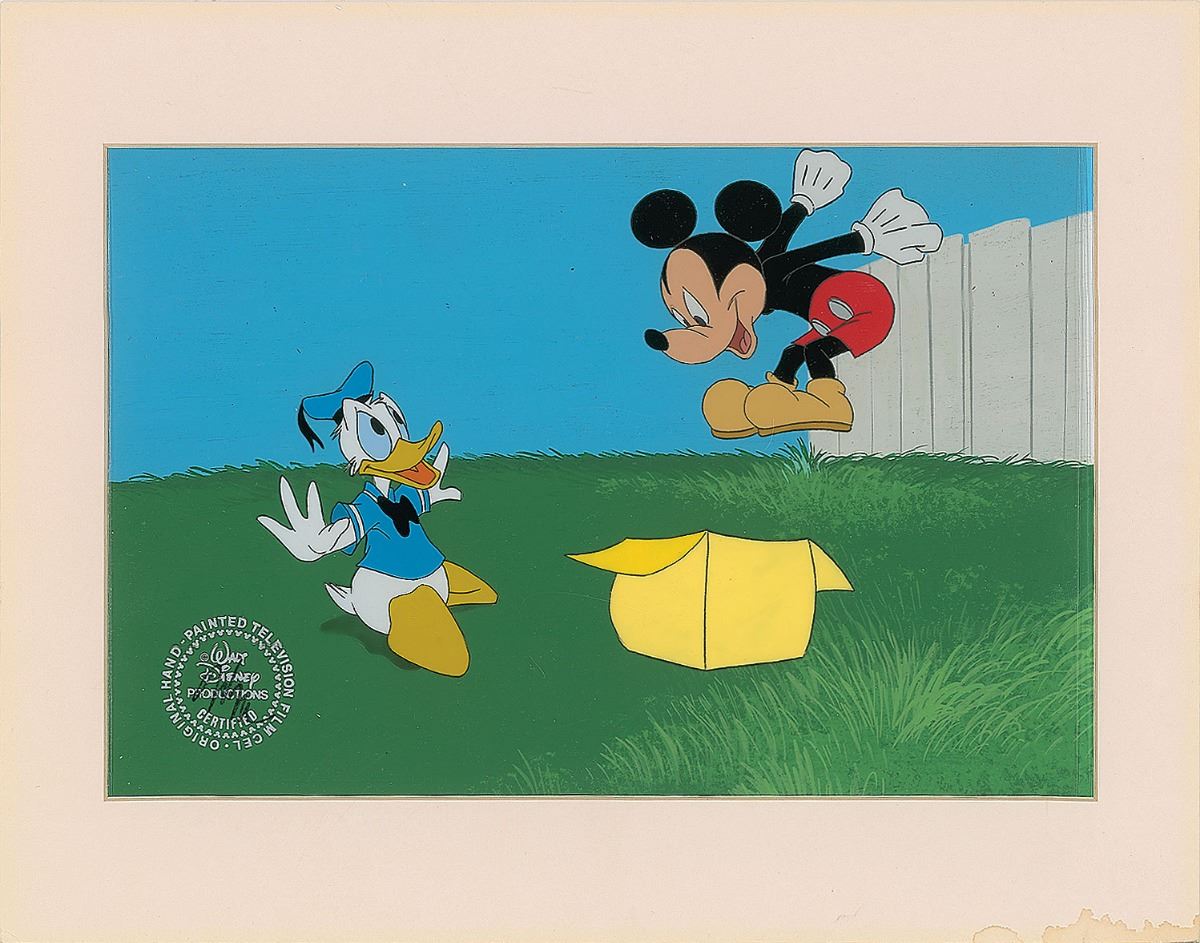 (Walt Disney Studios, 1980s) Original production cel and production background featuring Mickey Mouse and Donald Duck from a Disney Channel cartoon. The cel is placed on a hand-painted production background. Character images measure 3.5 x 3.25 and 2.75 x 3.75, with a mat opening of 11.5 x 7.5. Mat dimensions are 14 x 11. The piece has the silver Walt Disney Productions seal to lower left. In fine condition, with a small stain to the mat.