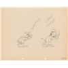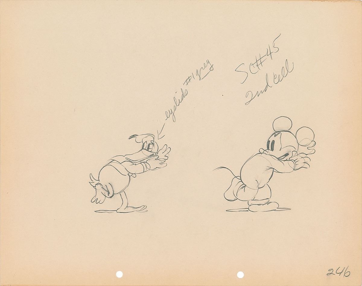 (Walt Disney Studios, 1935) Original production drawing from Mickey’s Service Station, showing Mickey Mouse and Donald Duck warily looking over their shoulders as they flee from an unseen assailant. Accomplished in graphite on untrimmed 12 x 9.5 animation paper. Images measure 2.75 x 2.25 (Donald) and 3.5 x 3 (Mickey). In fine condition.