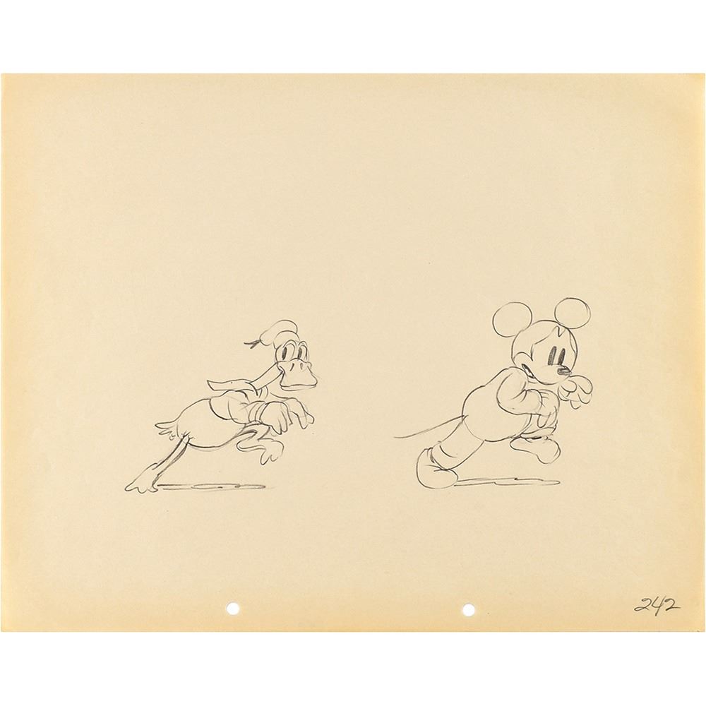 (Walt Disney Studios, 1935) Original production drawing featuring Mickey Mouse and Donald Duck from Mickey's Service Station, showing the two classic characters sneaking away. Accomplished in graphite on untrimmed 12 x 9.5 animation paper, marked "242" in the lower corner. The Mickey image measures 3.5 x 3.25, and Donald measures 3.5 x 3. In fine condition. Mickey's Service Station introduced Mickey Mouse, Donald Duck, and Goofy as a comedy trio, which would soon become a popular formula for Disney films.