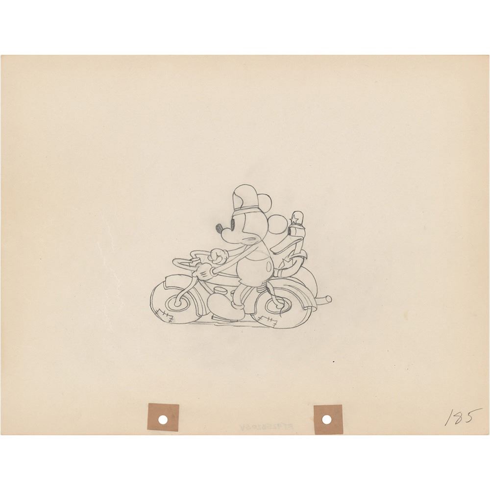 (Walt Disney Studios, 1934) Original production drawing featuring Mickey Mouse and Donald Duck from The Dognapper, showing them as cops riding a motorcycle. Accomplished in graphite on untrimmed 12 x 9.5 animation paper, marked "185" in the lower corner. Image measures 4.25 x 3.5. In fine condition. The Dognapper was Donald's third short and was the first adventure story to feature both Mickey and Donald.