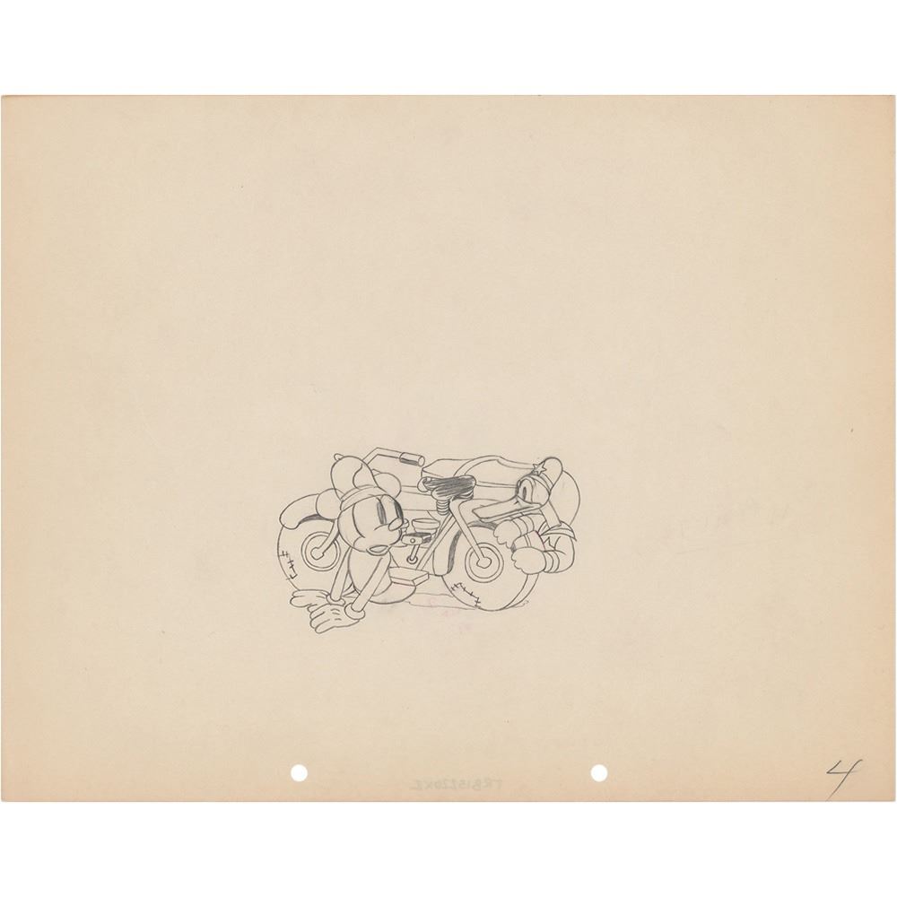 (Walt Disney Studios, 1934) Original production drawing featuring Mickey Mouse and Donald Duck from The Dognapper, showing them coming out from behind their motorcycle. Accomplished in graphite on untrimmed 12 x 9.5 animation paper, marked "4" in the lower corner. Image measures 4 x 2.5. In fine condition. The Dognapper was Donald's third short and was the first adventure story to feature both Mickey and Donald.
