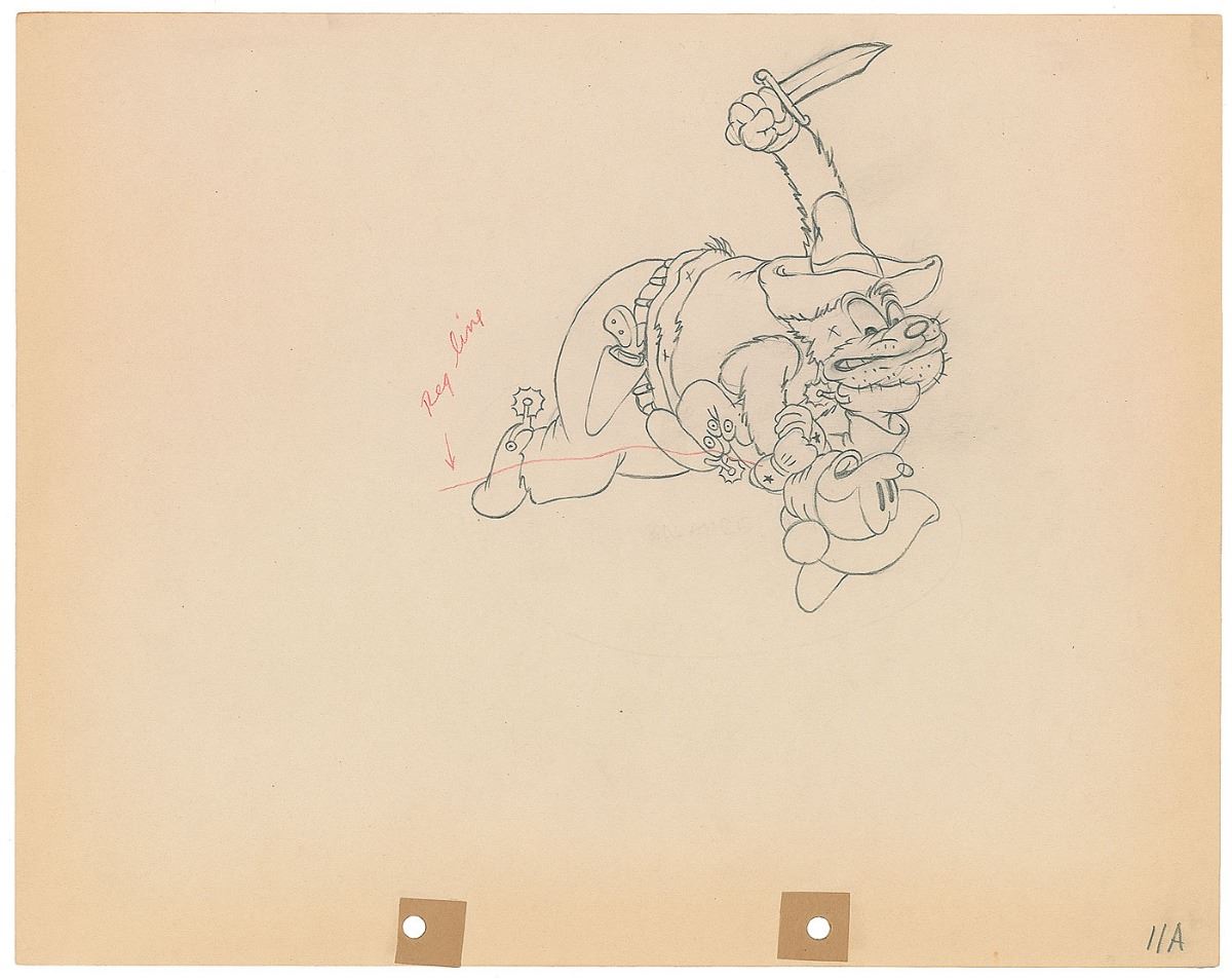 (Walt Disney Studios, 1934) Original production drawing featuring Mickey Mouse and Peg Leg Pete from Two-Gun Mickey, showing them engaged in a violent cowboy knife fight. Accomplished in graphite on untrimmed 12 x 9.5 animation paper. Image measures 4.5 x 5.75. In fine condition.
