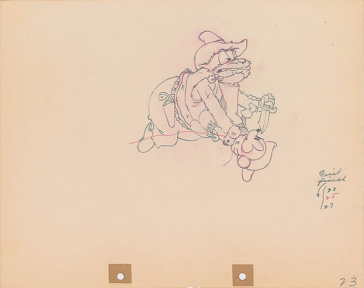 (Walt Disney Studios, 1934) Original production drawing featuring Mickey Mouse and Peg Leg Pete from Two-Gun Mickey, showing the two violently wrestling. Accomplished in graphite and colored pencil on untrimmed 12 x 9.5 animation paper. Image measures 4.5 x 5. In fine condition.