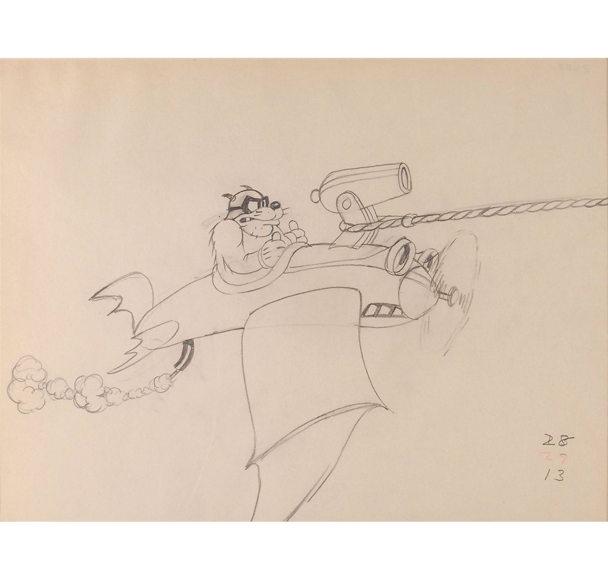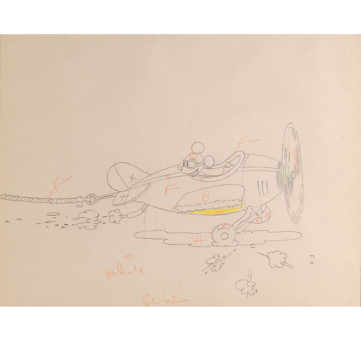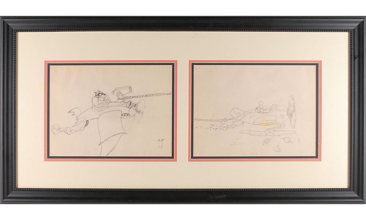 (Walt Disney Studios, 1933) Pair of original production drawings featuring Mickey Mouse and Peg Leg Pete from The Mail Pilot, showing Mickey in his plane after getting his wings shot off, showing him dragging Pete’s plane through the air on a rope. Accomplished in graphite and colored pencil on two sheets of animation paper. Images measure 11 x 6.5 and 9.5 x 5.5, with mat openings of 11 x 8.5. This piece is also framed to an overall size of 33.75 x 18. In fine condition. A nice pairing of production sketches.