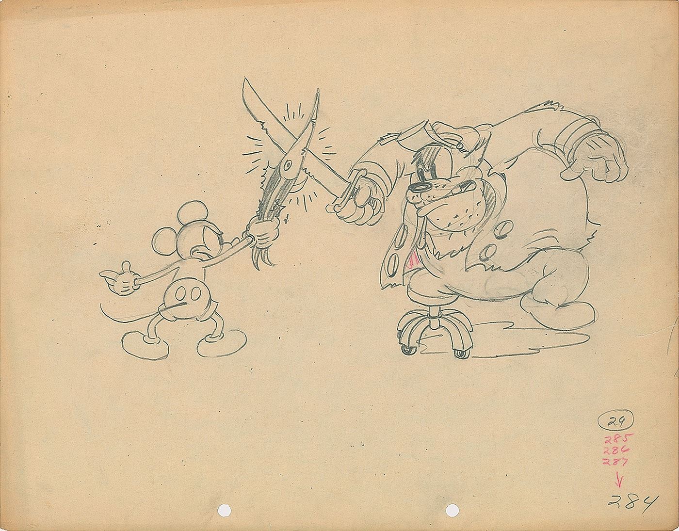 (Walt Disney Studios, 1934) Exciting original production drawing featuring Mickey Mouse and Pegleg Pete from Shanghaied, showing them engaged in their classic fish-versus-sword fight. Accomplished in graphite on untrimmed 12 x 9.5 animation paper. Image measures 9.5 x 5. In fine condition.