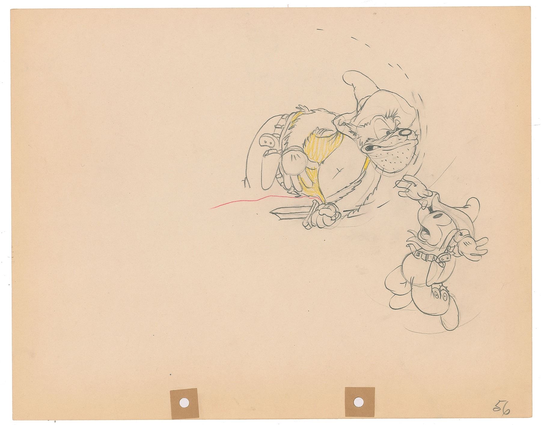 (Walt Disney Studios, 1934) Original production drawing featuring Mickey Mouse and Pegleg Pete from Two-Gun Mickey, showing Mickey dodging a knife during their fight. Accomplished in graphite and colored pencil on untrimmed 12 x 9.5 animation paper, marked "56" in the lower right. Images measure 2.5 x 3.5 (Mickey) and 4 x 3.5 (Pete). In fine condition.