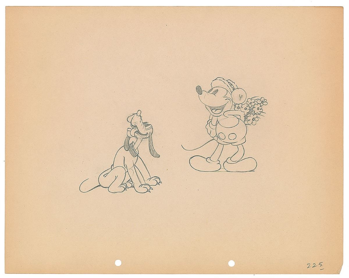 (Walt Disney Studios, 1933) Fantastic original production drawing from Puppy Love featuring Pluto and Mickey, with the latter wearing a straw boat hat and hiding a bouquet of flowers behind his back. Accomplished in graphite on untrimmed 12 x 9.5 animation paper. Images measure 3 x 3 and 3 x 3.25. In fine condition.