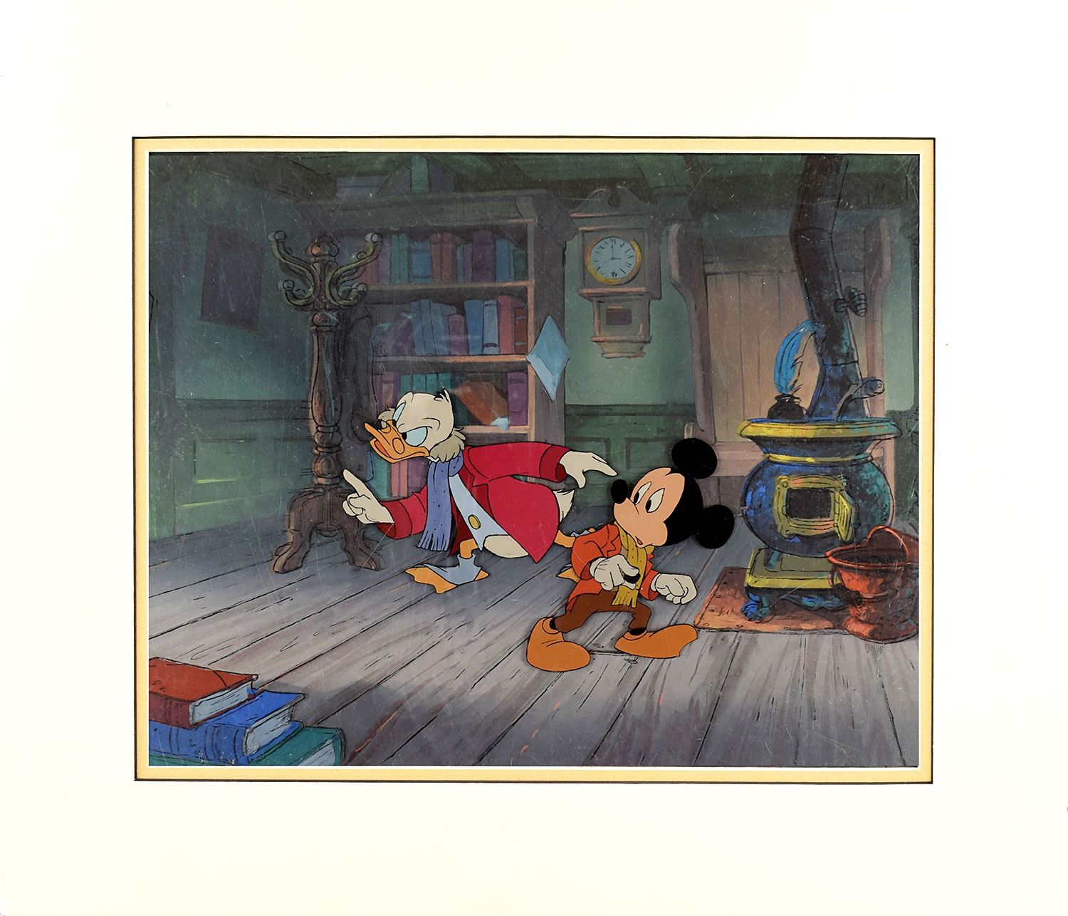 (Walt Disney Studios, 1983) Original production cels and production background featuring Mickey Mouse and Scrooge from Mickey's Christmas Carol, showing them at the woodstove and coal bucket inside Scrooge's office. Both full 16-field cels are placed on a 16-field hand-painted production background of Scrooge's office, with key line background overlay cel. The cel of Mickey is key to a very similar background that appeared when Scrooge first entered the office, and caught Mickey trying to put a piece of coal in the stove; this background appears moments later, after Scrooge knocks the coal from Mickey's hand. The cel of Scrooge appears after Donald reappears at the office door, hangs a wreath on the doorknob, and wishes Scrooge another merry Christmas. Mickey's image measures 3.5 x 4.5 and Scrooge measures 4.5 x 3.75, with a mat opening of 14 x 11. Double-matted to an overall size of 19.5 x 16.5. In fine condition. An important, near-matching set-up from Disney's classic adaptation of A Christmas Carol by Charles Dickens, starring Mickey Mouse as Bob Cratchit and Scrooge McDuck as Ebenezer Scrooge.