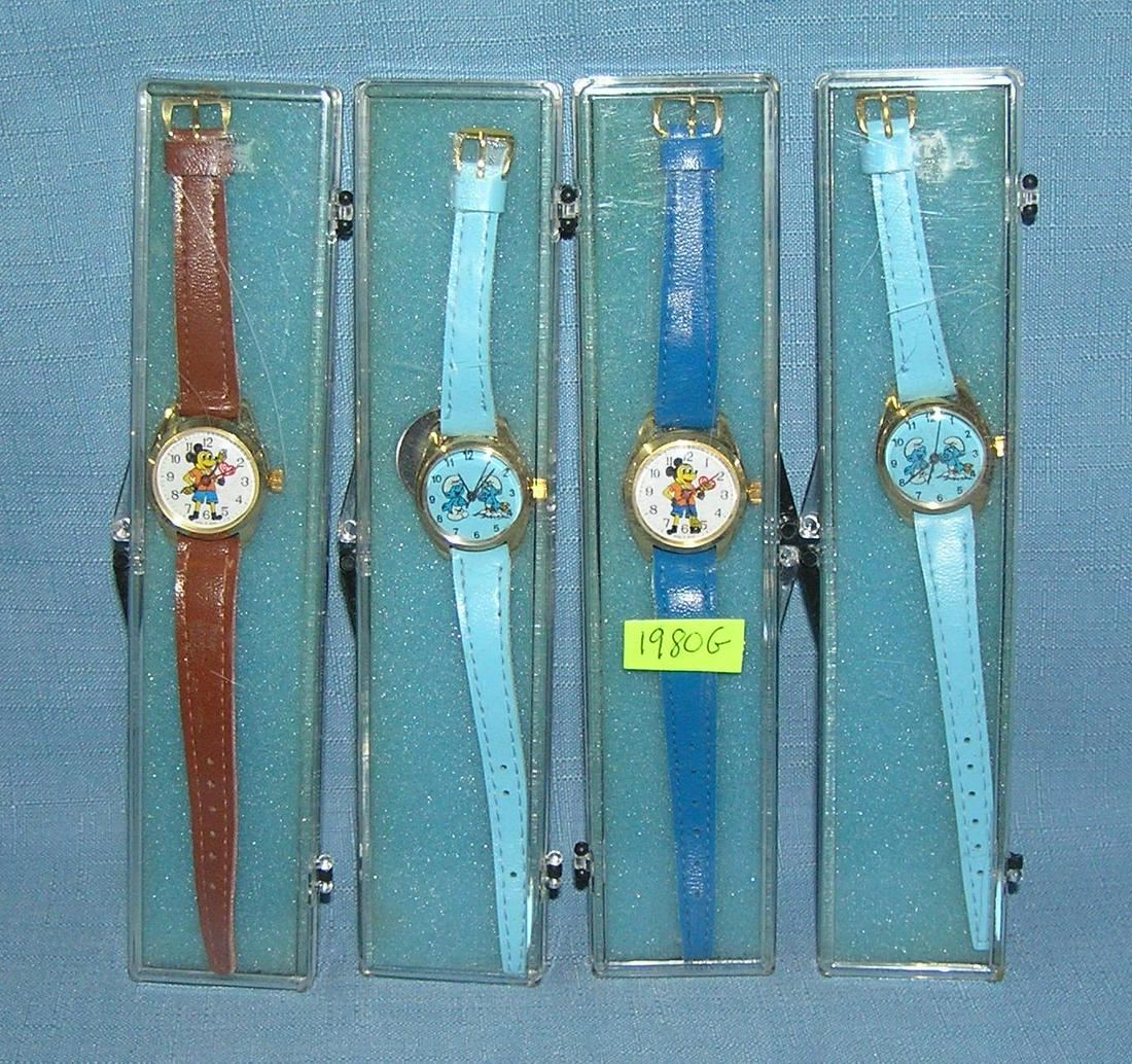 Group of 4 mint in box cartoon character wrist watches includes Mickey Mouse and Smurfs, 4 pieces total est. value $150.00-$200.00