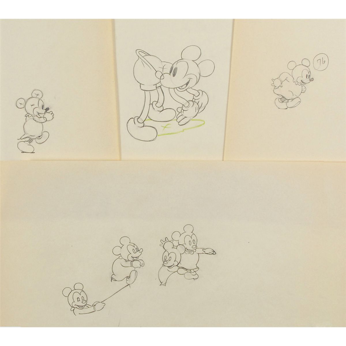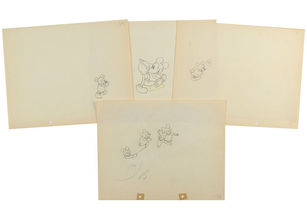 (Walt Disney Studios, 1932) Original set of four production drawings featuring Mickey Mouse and his nephews from Mickey’s Nightmare. Accomplished in graphite and colored pencil on four sheets of untrimmed 12 x 9.5 animation paper. Overall image sizes range from 1.5 x 2 to 5.5 x 3.5, including one large sketch of Mickey, one of his nephews in a group, and two picturing Mickey’s nephew alone. In overall fine condition.
