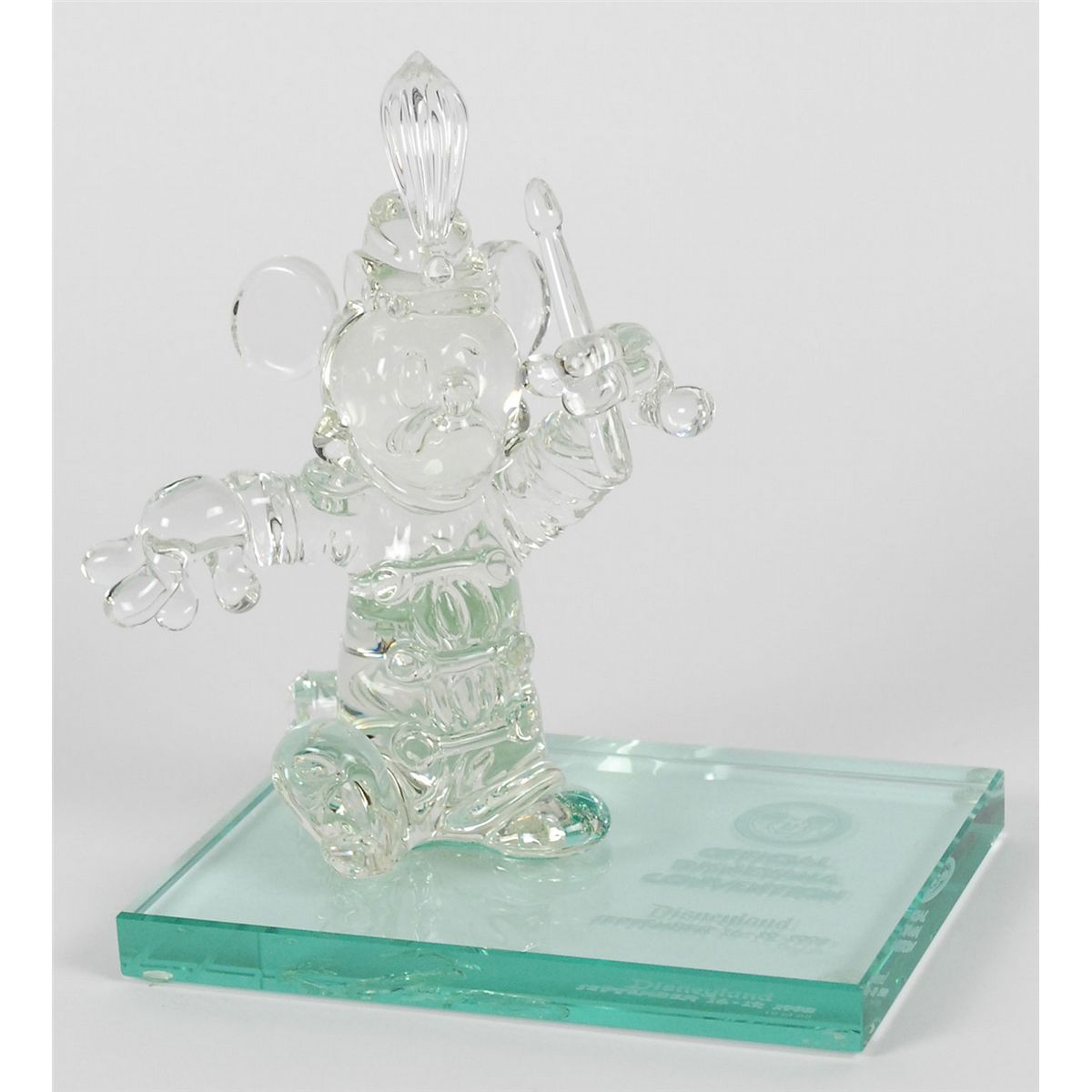 Beautiful limited edition glass figurine of Mickey Mouse in his bandleader costume, numbered 19/25, measuring 9.5? tall on an 8 x 6 base. The likeness was produced by the Arribas Brothers and released at the 1993 Official Disneyana Convention in Anaheim, where this rare piece sold out within 23 minutes. In fine condition. Accompanied by the certificate of authenticity, original box, and a limited edition catalog listing an example of this figurine. An excessively rare and positively stunning piece.
