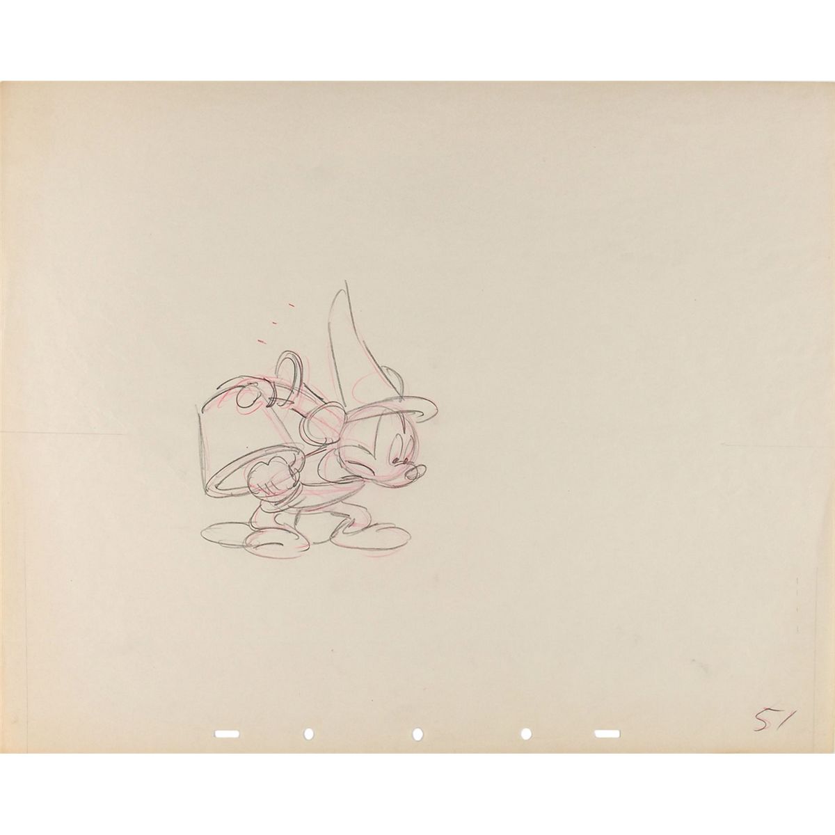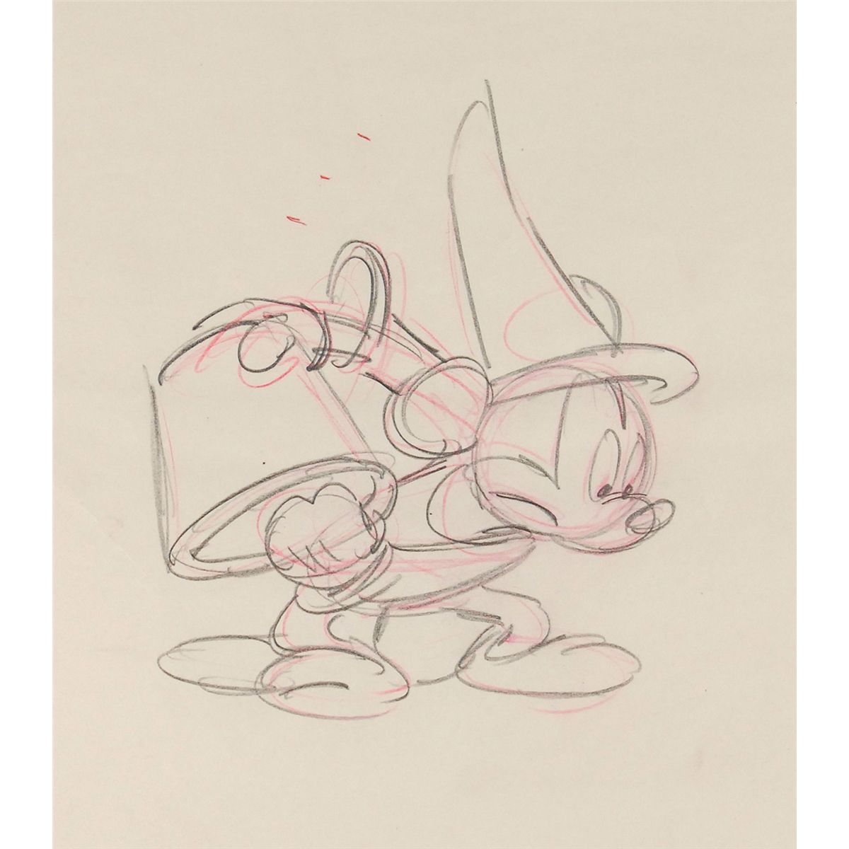 (Walt Disney Studios, 1940) Original ‘rough’ production drawing featuring Mickey Mouse as the Sorcerer's Apprentice from Fantasia, showing him holding the bucket he uses to fetch water before attempting to use an enchanted broom. Accomplished in graphite and red pencil on untrimmed 15.5 x 12.5 animation paper. Image measures 4.5 x 5. In fine condition. The pail is used as a central device in this iconic segment of Fantasia, and production materials showing Mickey Mouse with both the bucket and sorcerer’s hat are excessively rare.