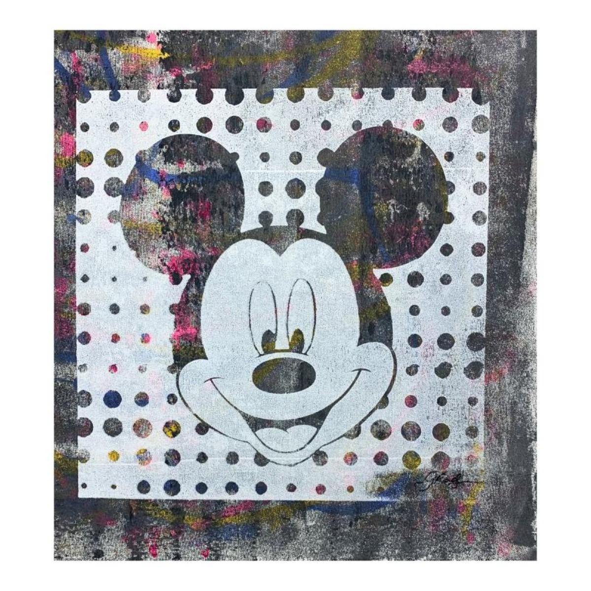 "Mickey Mouse" is an original hand pulled silkscreen and acrylic painting on canvas by Gail Rodgers. Hand signed by the artist, the piece comes with a letter of authenticity. This piece is meant to be gallery wrapped and measure approximately 23" x 23" and image dimensions (after stretching) 16" x 16" (image).