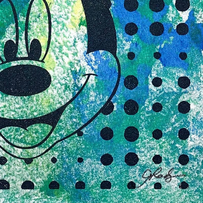 "Mickey Mouse" is an original hand pulled silkscreen and acrylic painting on canvas by Gail Rodgers. Hand signed by the artist, the piece comes with a letter of authenticity. This piece is meant to be gallery wrapped and measure approximately 23" x 23" an
