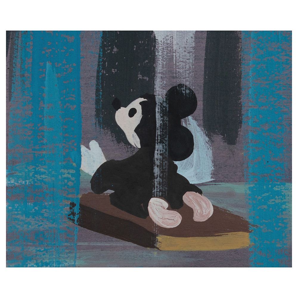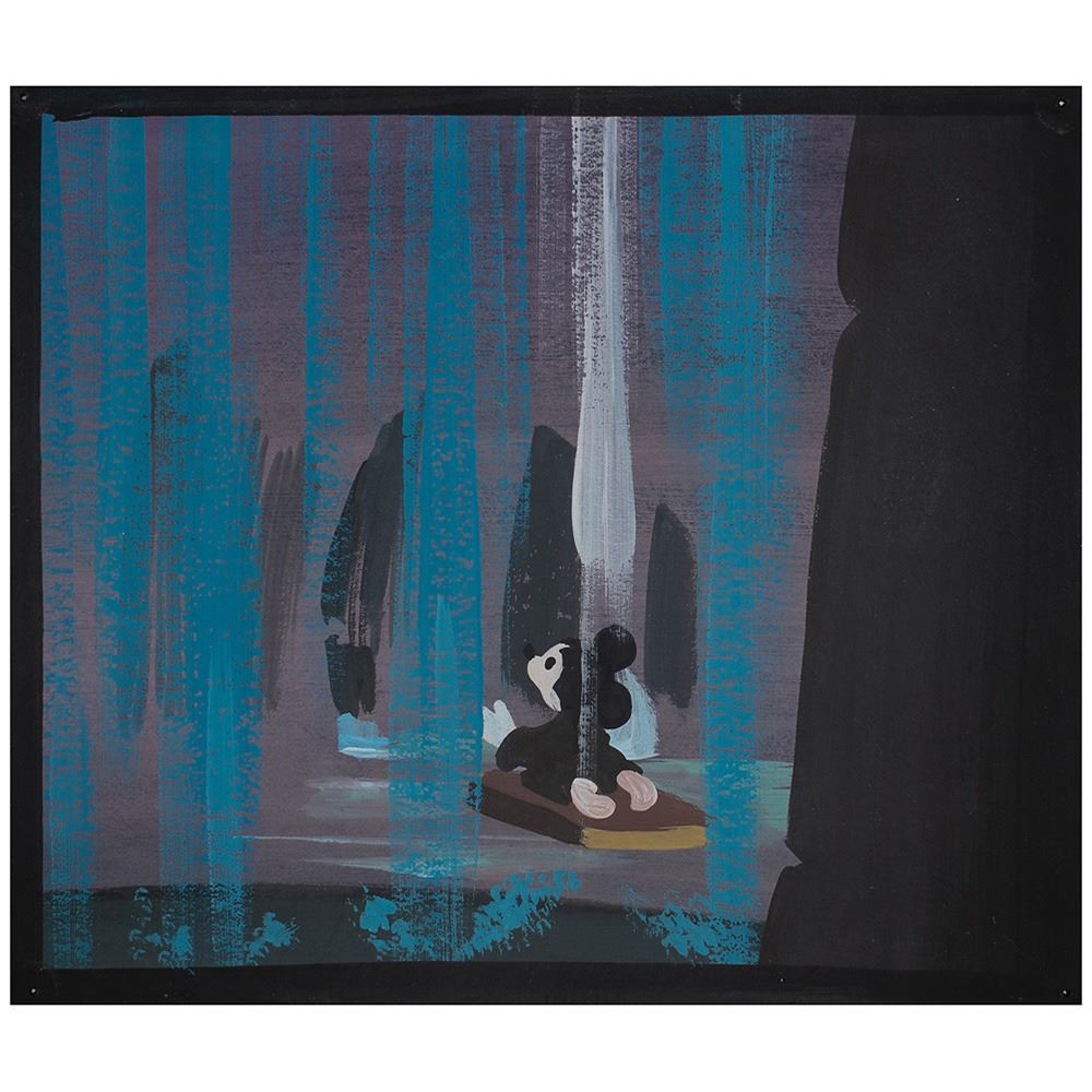 (Walt Disney Studios, 1940) Original concept painting of Mickey Mouse from the 'Sorcerer's Apprentice' segment of Fantasia, which shows the young wizard-to-be floating on Yen Sid's large spellbook as water pours all around him during the climax of the segment. Accomplished in gouache on black 7 x 6 artist's board. In fine condition, with tack holes to corners.